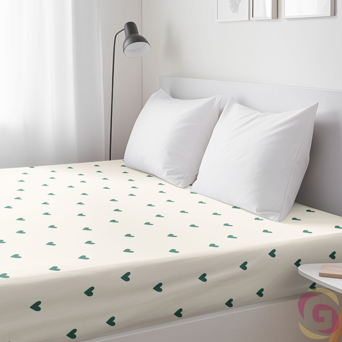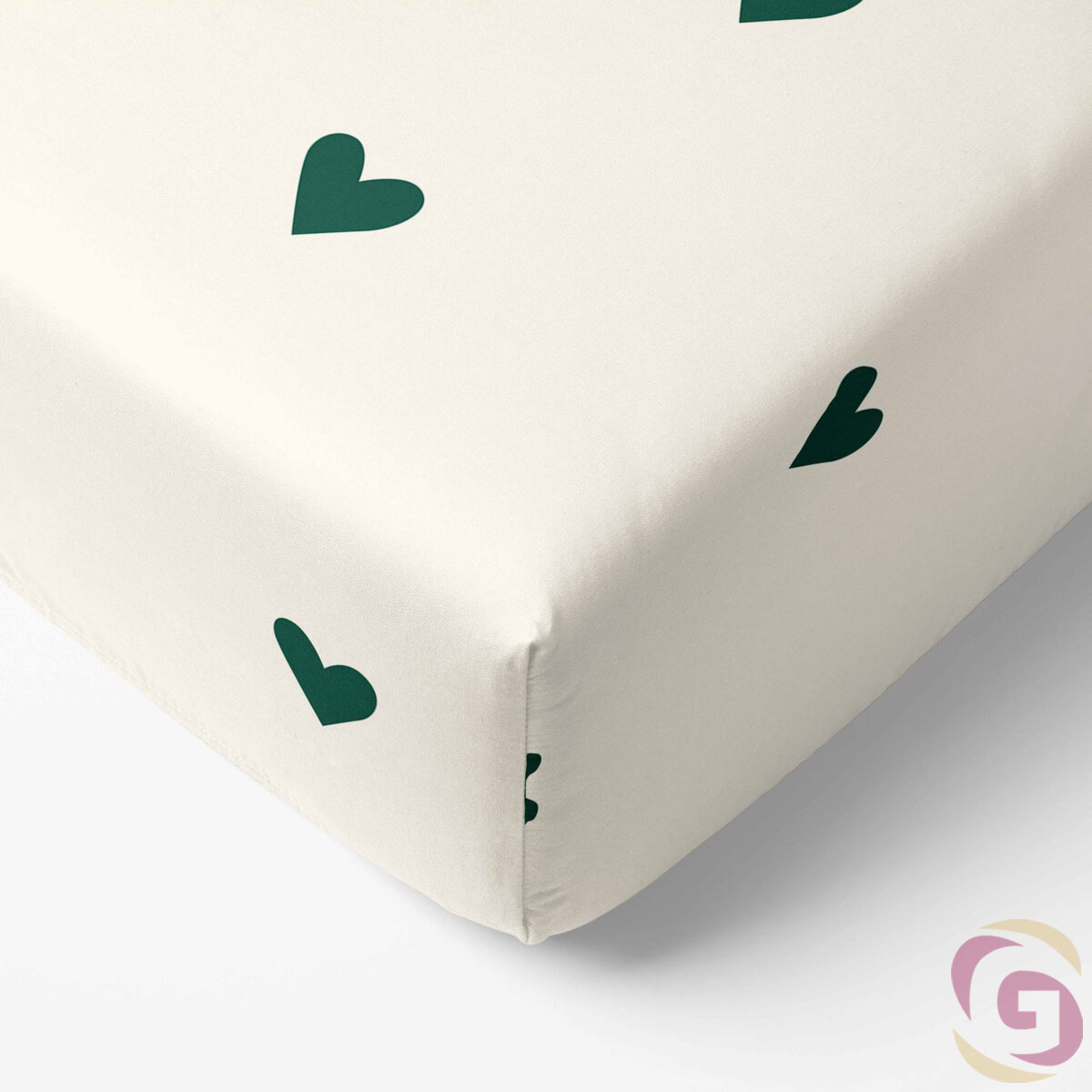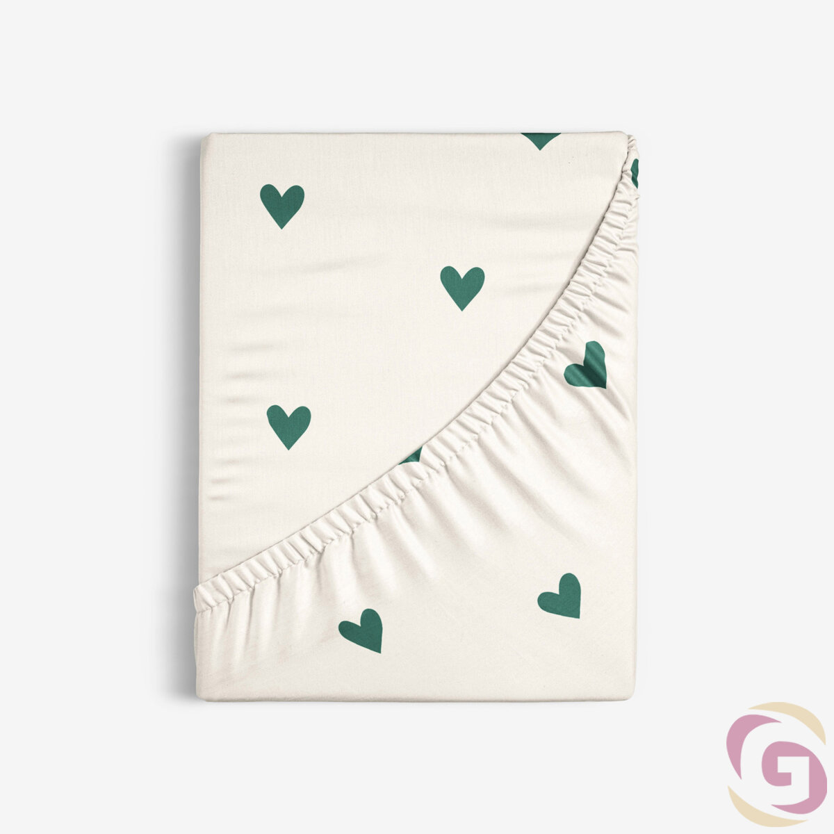 Bettlaken mit Motiv dunkelgrüne Herzchen schaffen eine ruhige und ungestörte Atmosphäre in Ihrem Schlafzimmer für die bestmögliche Erholung. Dieses Baumwolllaken (mit Gummizug) besteht aus 100% glatter Baumwolle mit einem Gewicht von 145 g/m2. Der Grundstoff des Lakens ist elfenbein.