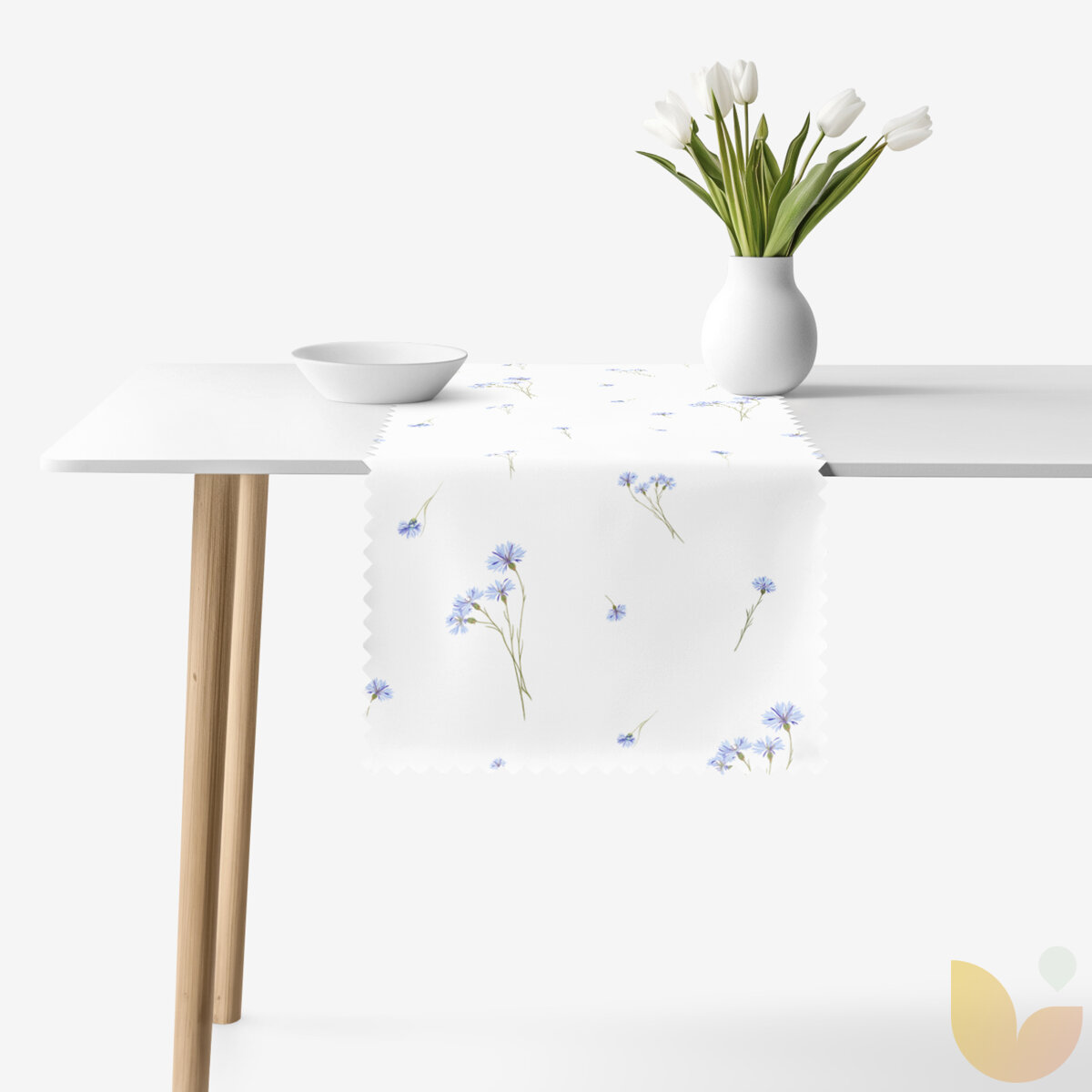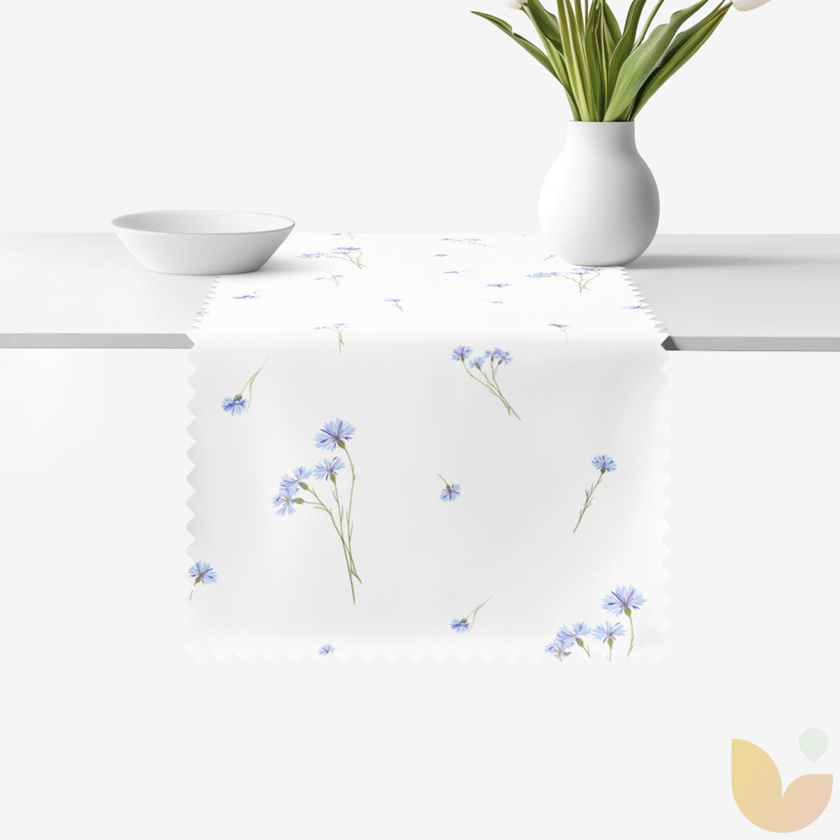 Tischläufer mit Motiv blauer Kornblumen ergänzt jeden Tisch auf natürliche Weise. Zarte Blumen unterstreichen die angenehmen Momente beim Essen mit Familie oder Freunden.