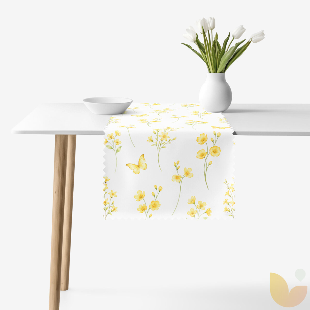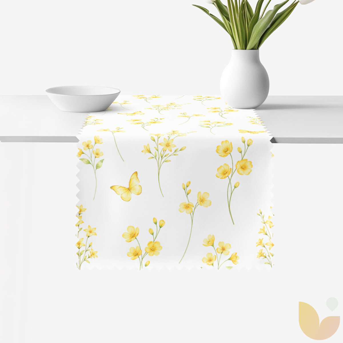 Ein Tischläufer mit Motiv einer gelben Wiese bringt die ruhige Schönheit der Natur und einen Hauch von Wohlbefinden auf Ihren Tisch. Zarte Blumen ergänzen dezent das tägliche Essen sowie die Momente mit Familie und Freunden.