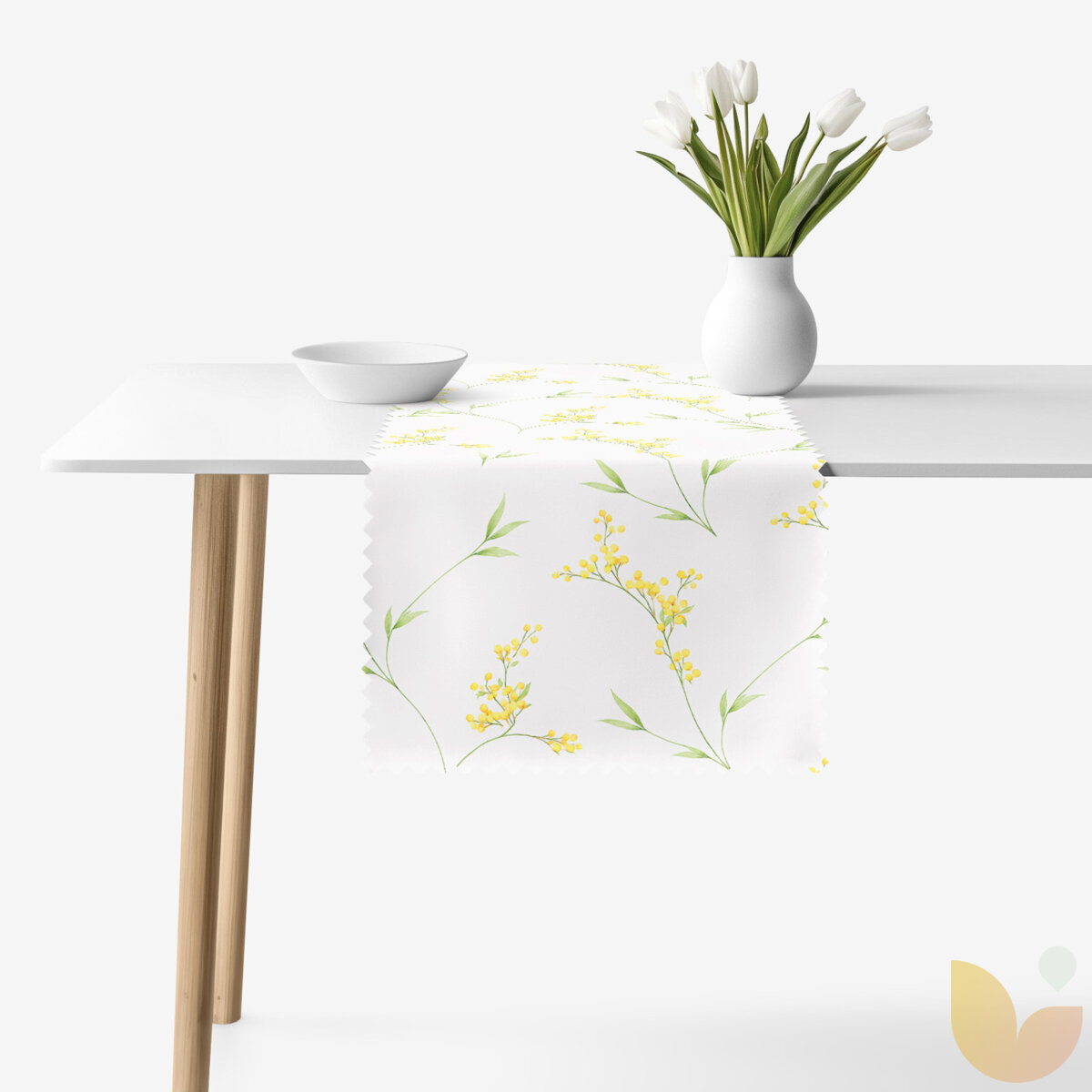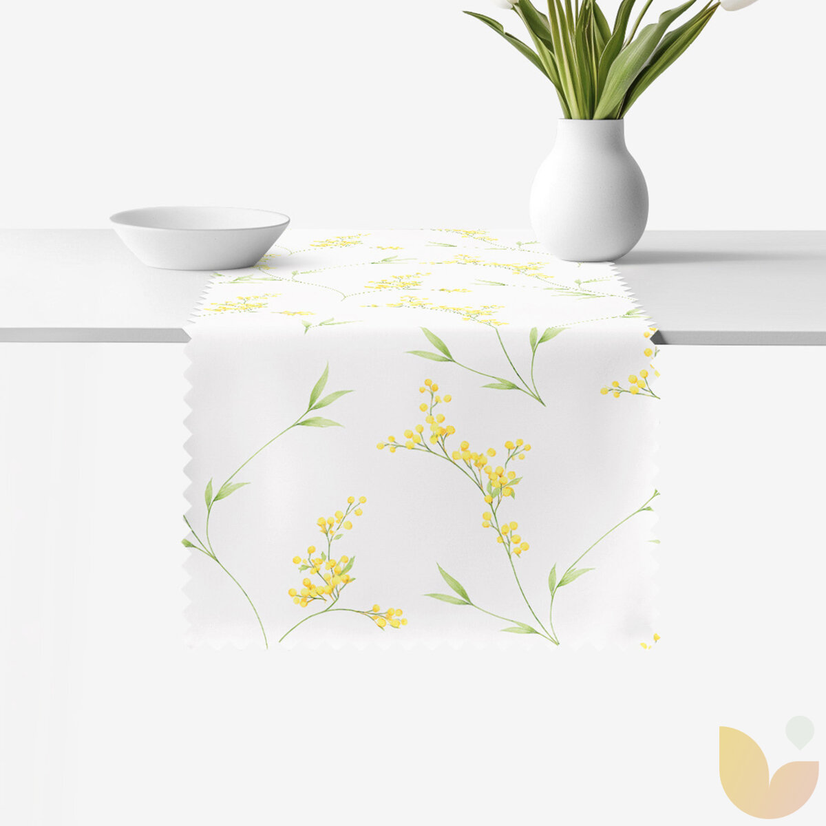 Ein Tischläufer mit Mimoseblüten-Motiv verleiht dem Tisch ein frisches Aussehen, lässt sich leicht mit anderen Accessoires kombinieren und eignet sich für den täglichen sowie saisonalen Gebrauch.