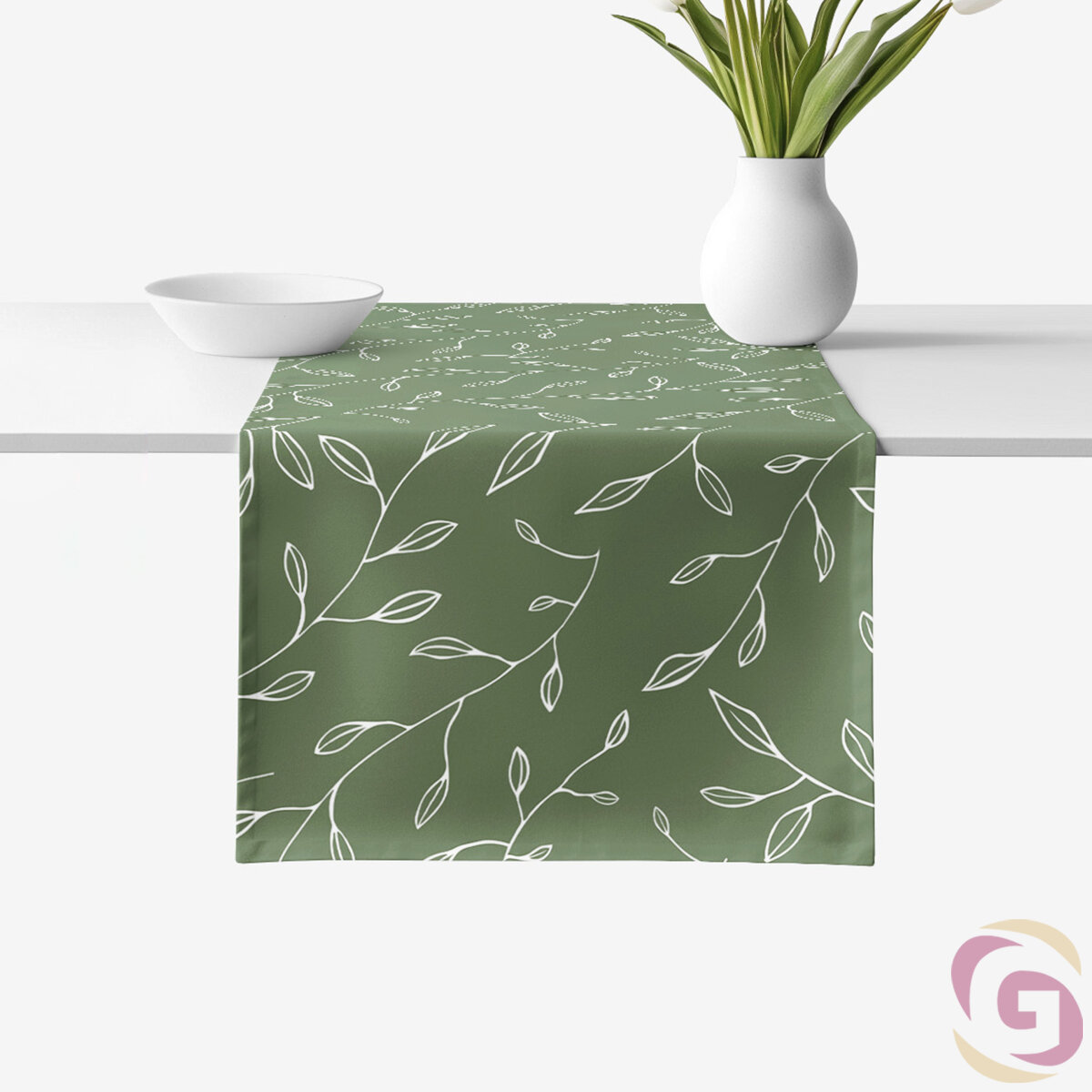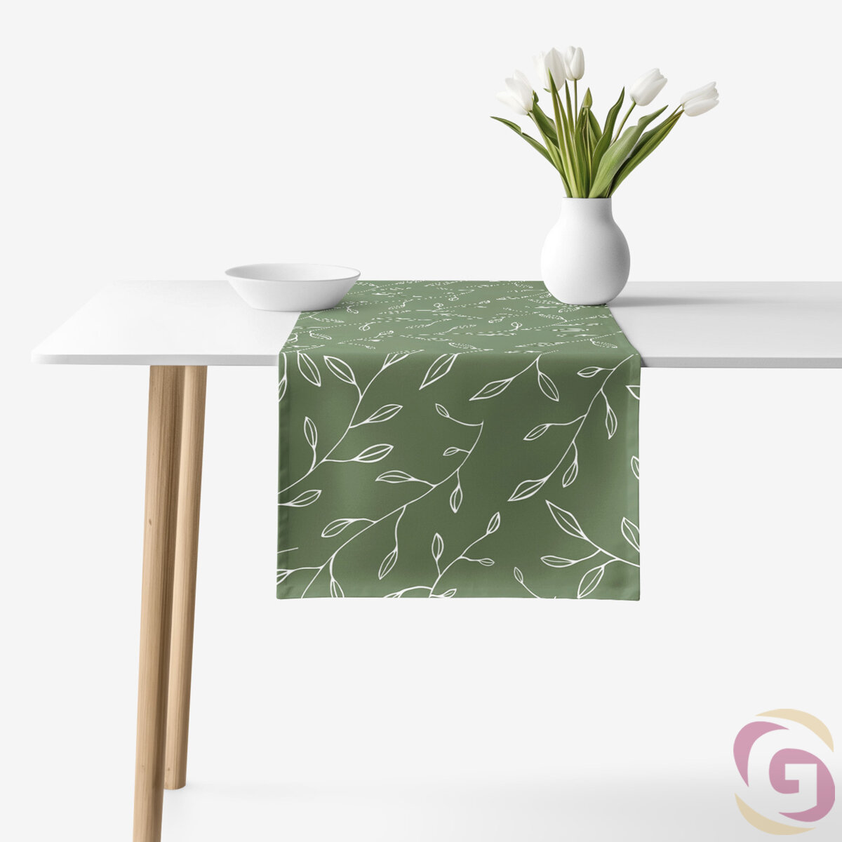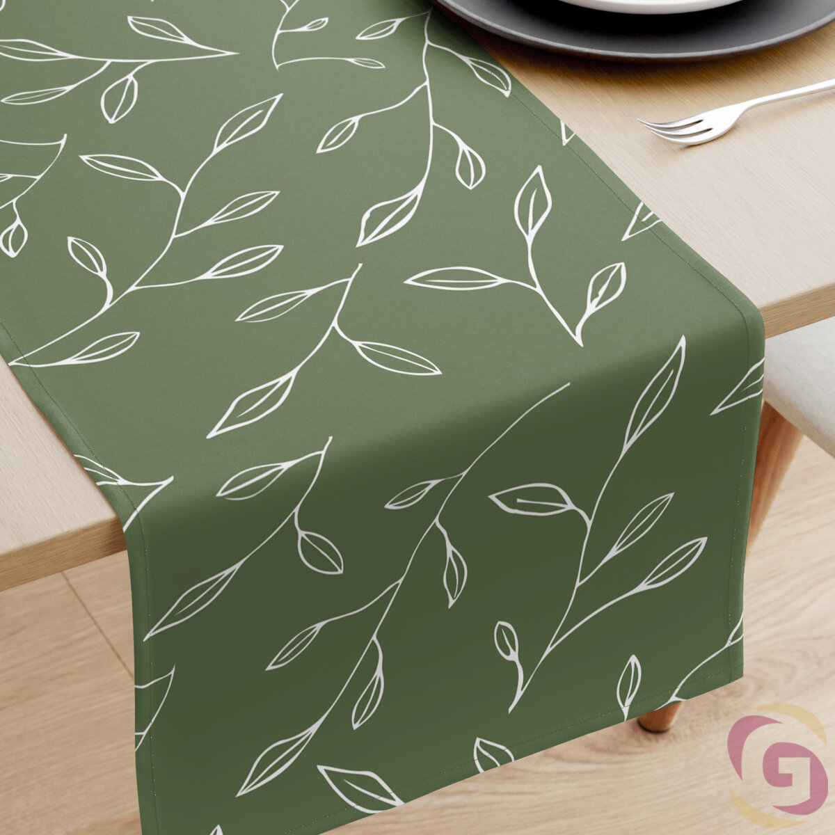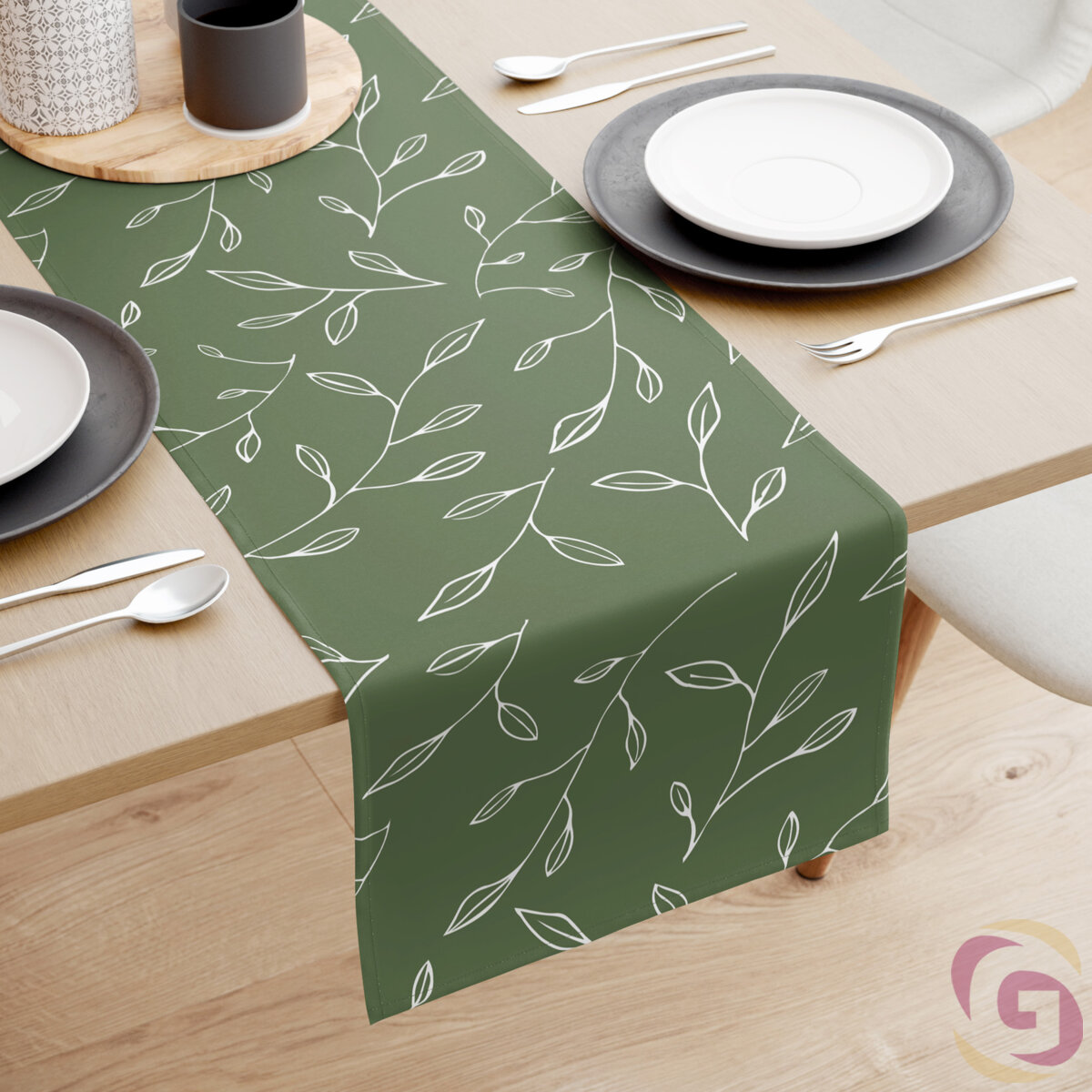 Hochwertiger Tischläufer aus Baumwolle mit einem Motiv Teeblätter auf grünem Hintergrund. Er ist aus hochwertigem 100% Baumwollstoff mit einem Gewicht von 145g/m2 hergestellt. Der Läufer ist rundum gesäumt. Er ist eine sehr praktische und moderne Wohnaccessoire für einen Ess- oder Konferenztisch.