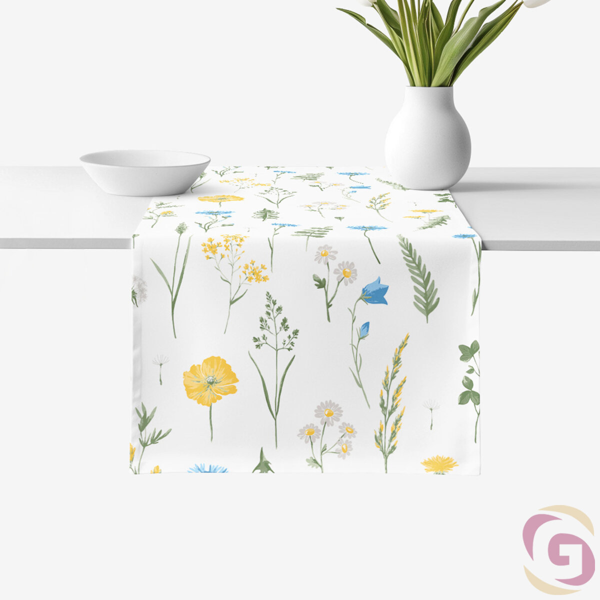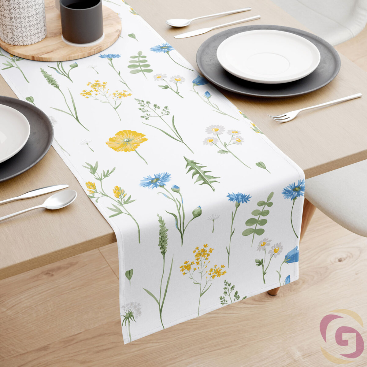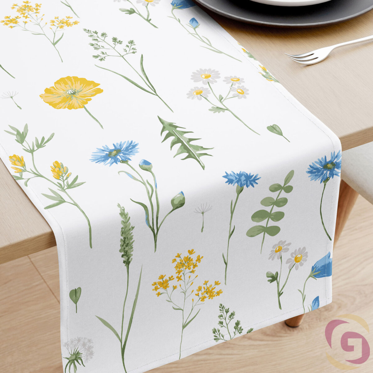 Hochwertiger Tischläufer aus Baumwolle mit einem originellen Motiv Wiesenblume und Gräser auf weißem Hintergrund. Er ist aus hochwertigem 100% Baumwollstoff mit einem Gewicht von 145g/m2 hergestellt. Der Läufer ist rundum gesäumt. Er ist eine sehr praktische und moderne Wohnaccessoire für einen Ess- oder Konferenztisch.