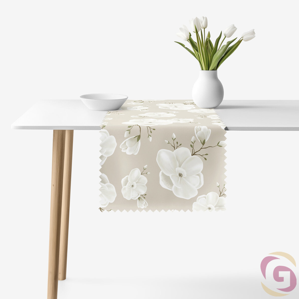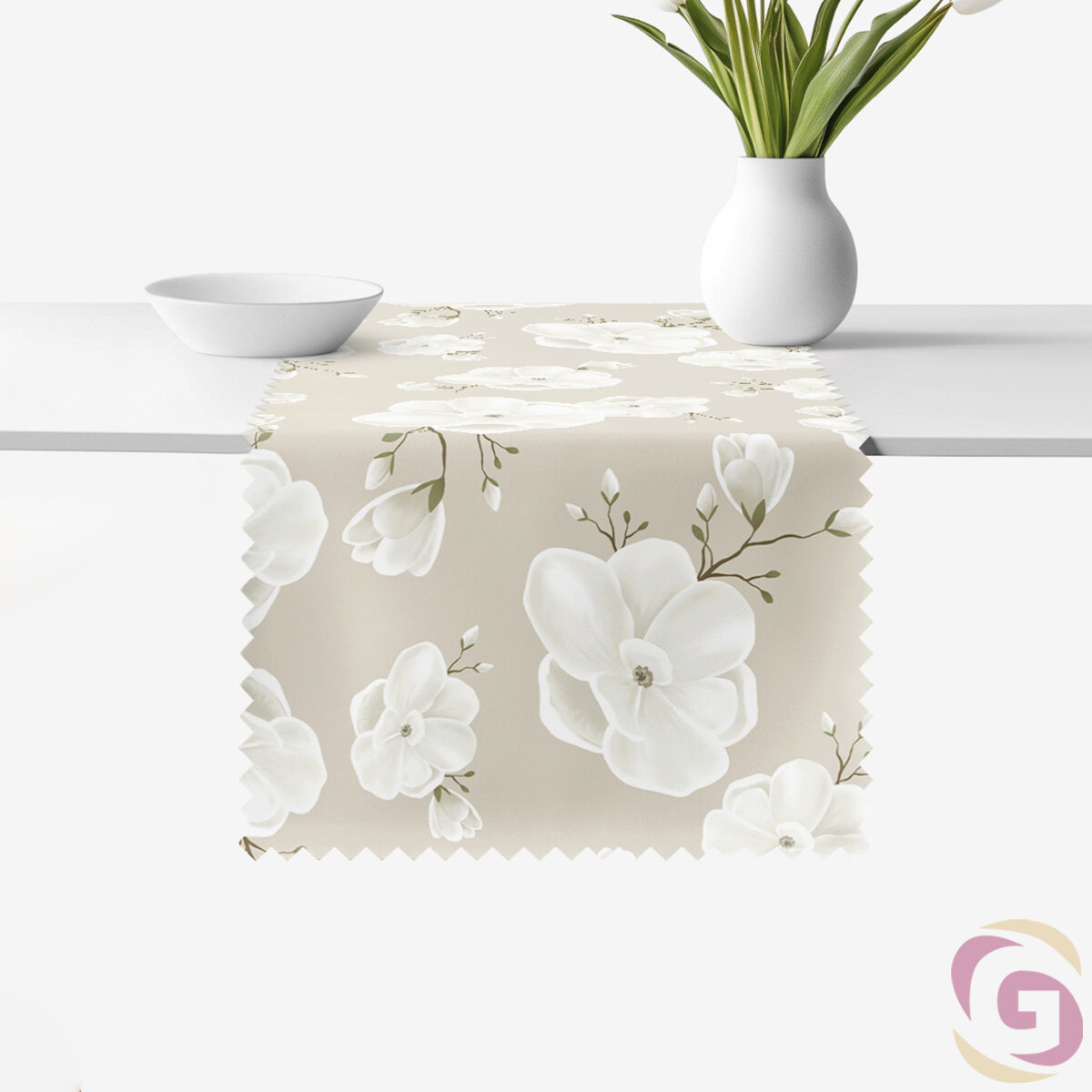 Teflon-Tischläufer mit Motiv wieße Blumen auf graubraunem Hintergrund. Er ist aus teflonbeschichtetem Dekostoff aus 100 % Polyester mit einem Gewicht von 220 g/m2 hergestellt. Dank der Teflon-Behandlung dringt verschüttete Flüssigkeit nicht in die Lauffläche ein und bleibt nur in Form von Tröpfchen auf der Oberfläche zurück. Die Lauffläche ist schmutzabweisend - sie ist leicht abwaschbar. Verschmutzungen müssen nur mit einem feuchten Tuch abgewischt werden. Er ist eine sehr praktische und moderne Ergänzung für einen Ess- oder Konferenztisch.