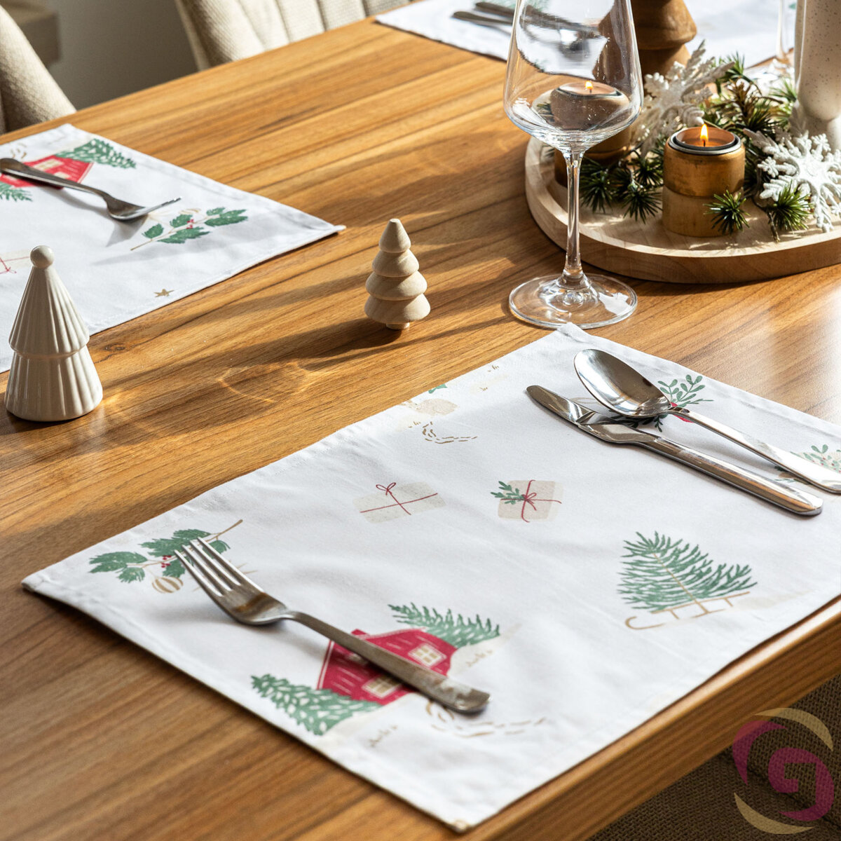 Tischset aus Baumwollköper mit Motiv traditionelle Weihnachten auf weißem Hintergrund. Es ist aus fester 100%iger Baumwolle mit einem Gewicht von 190g/m2 hergestellt. Die Tischsets sind rundum gesäumt. Das Tischset ist eine sehr praktische und moderne Ergänzung für den Esstisch.