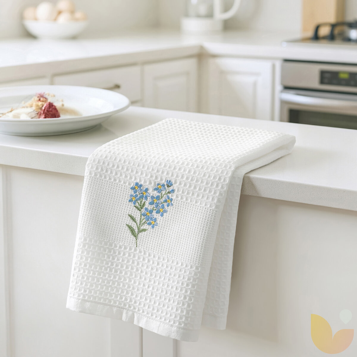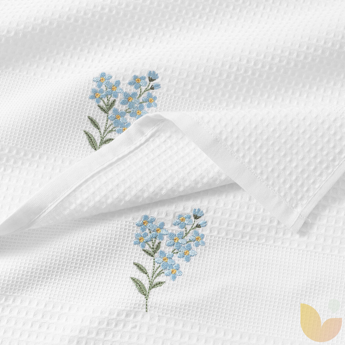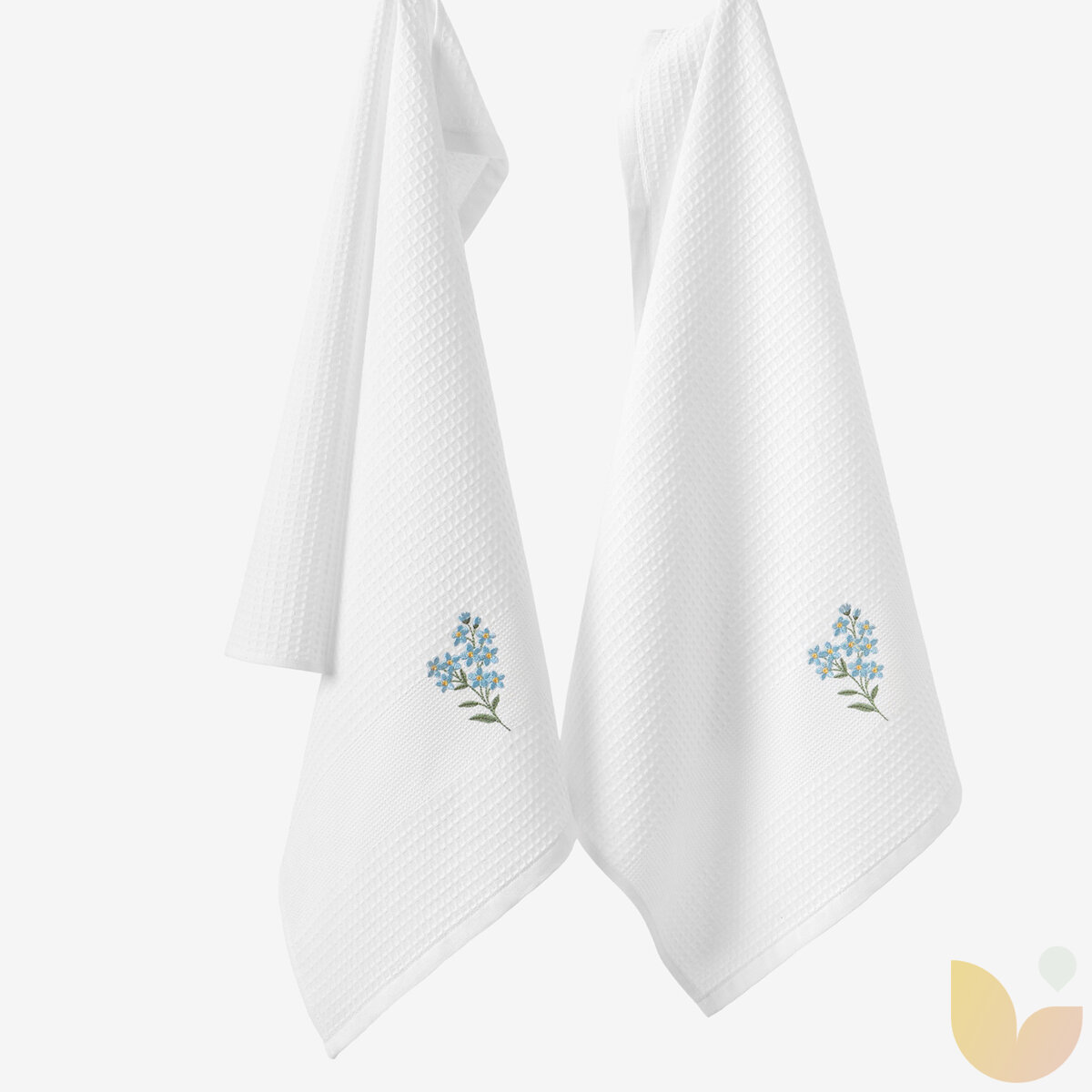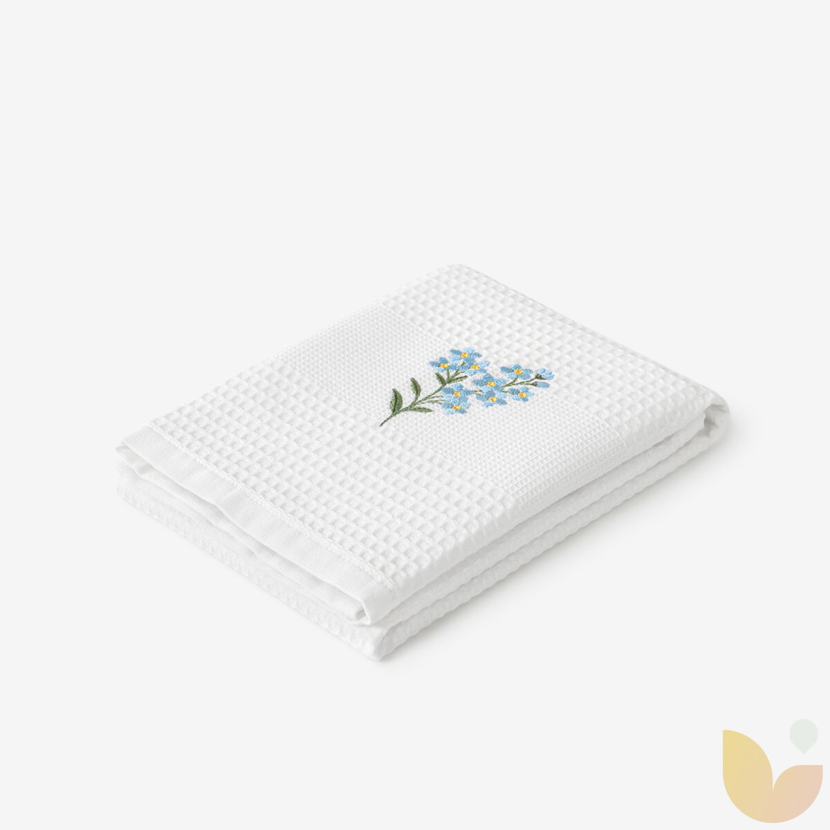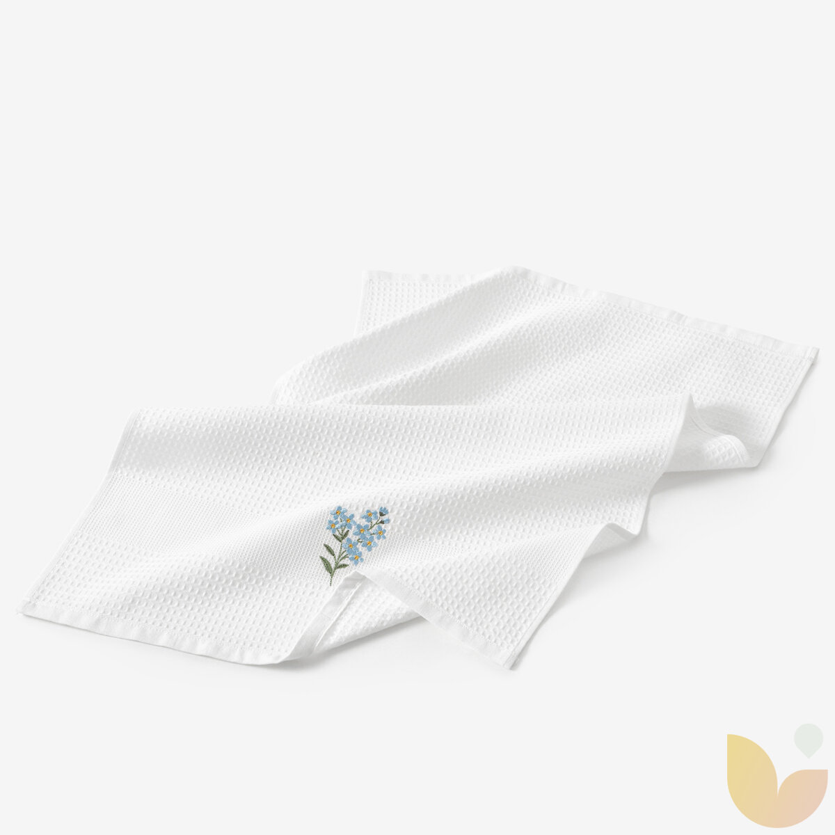 Waffel-Geschirrtuch mit Stickerei - Vergissmeinnicht auf Weiß
