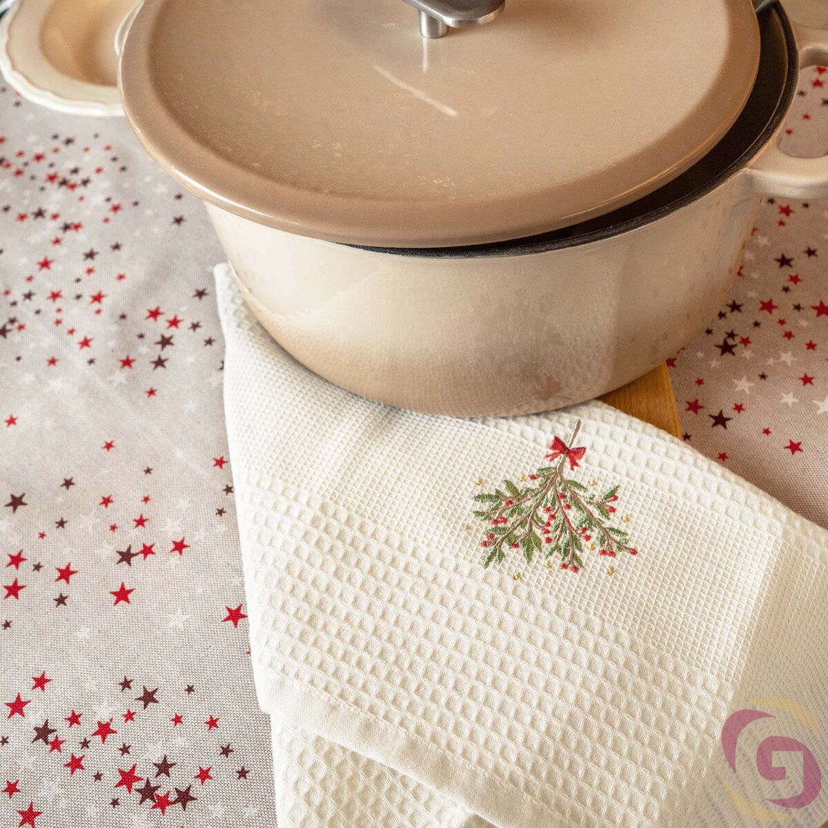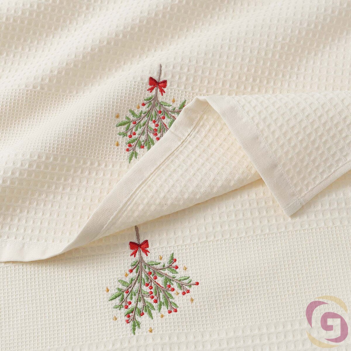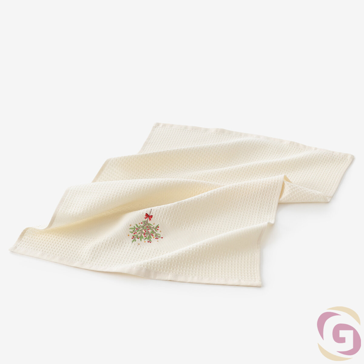 Waffel-Geschirrtuch mit Weihnachtsstickerei - Mistel auf cremefarbenem Grund