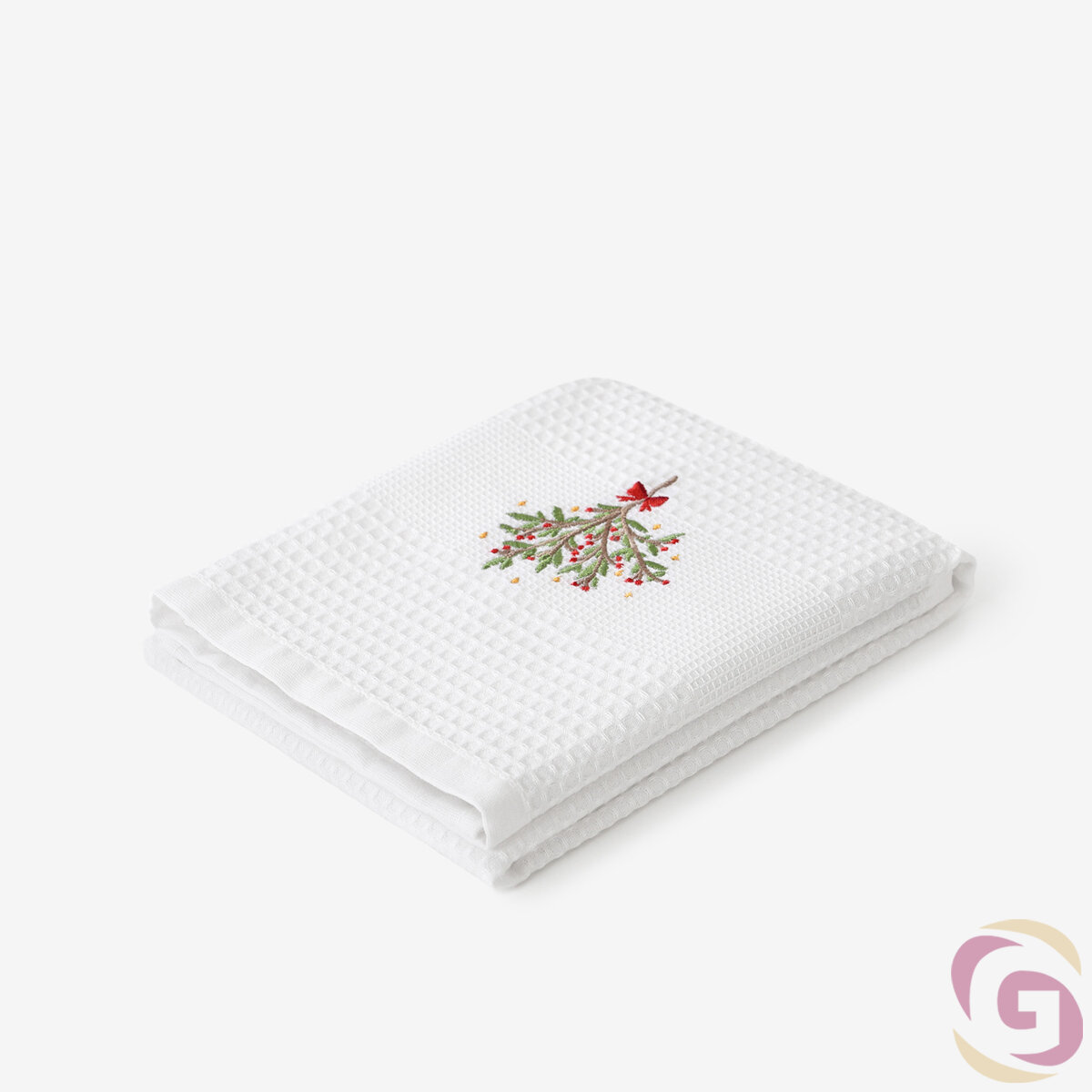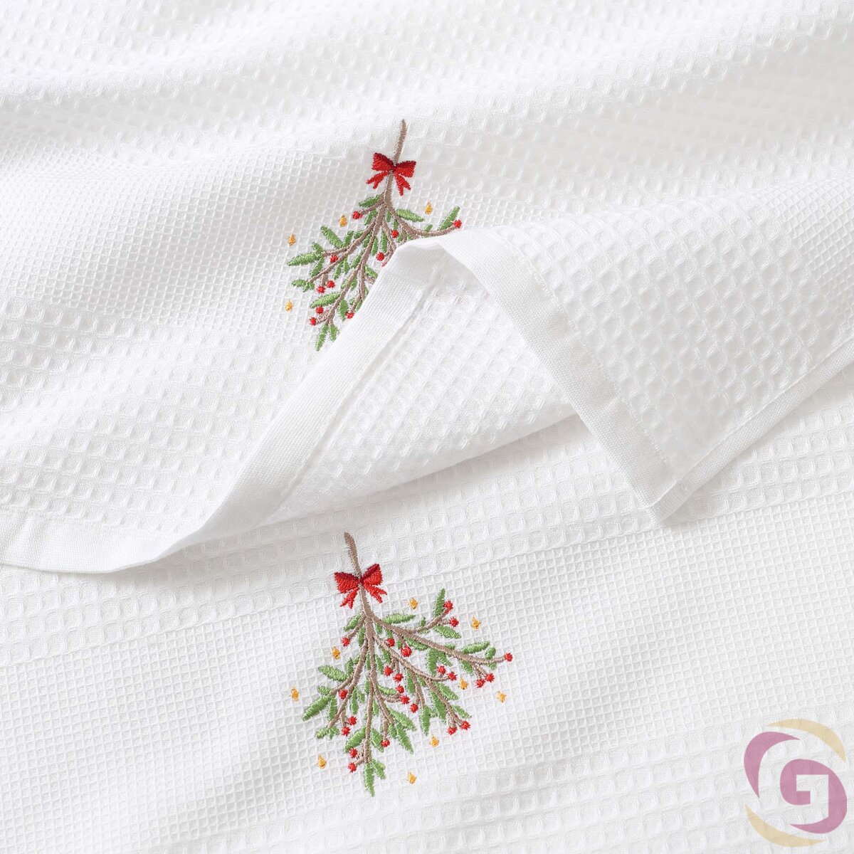 Waffel-Geschirrtuch mit Weihnachtsstickerei - Mistel auf weißem Grund
