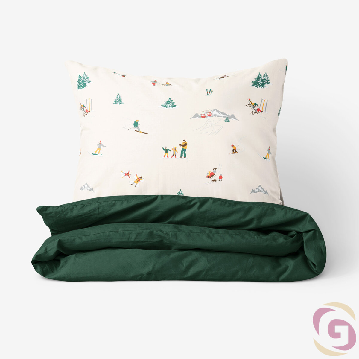 Die Duo-Bettwäsche ist wendbar – auf der einen Seite das winterlichen Vergnügungen, auf der anderen Seite einfarbig in Dunkelgrün.