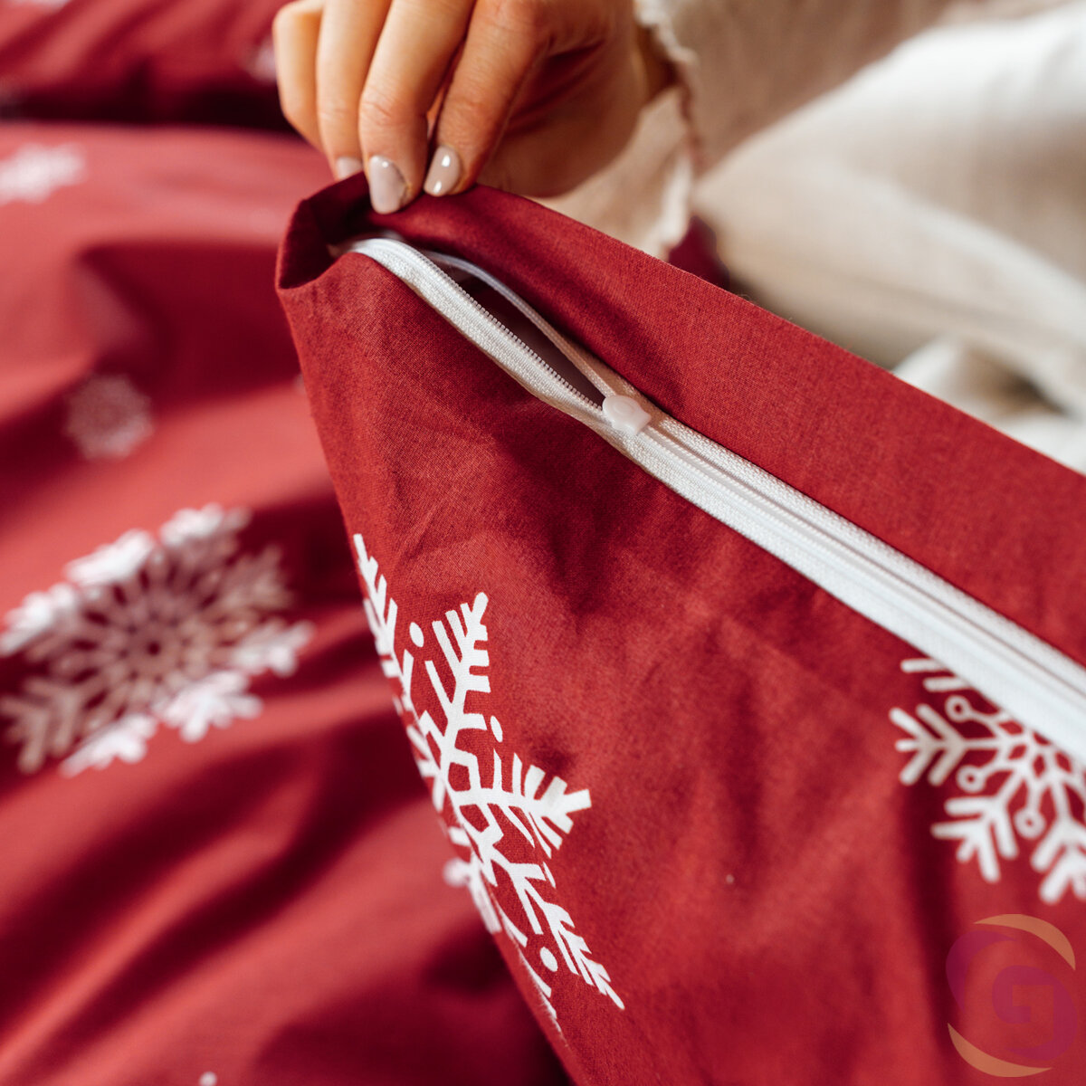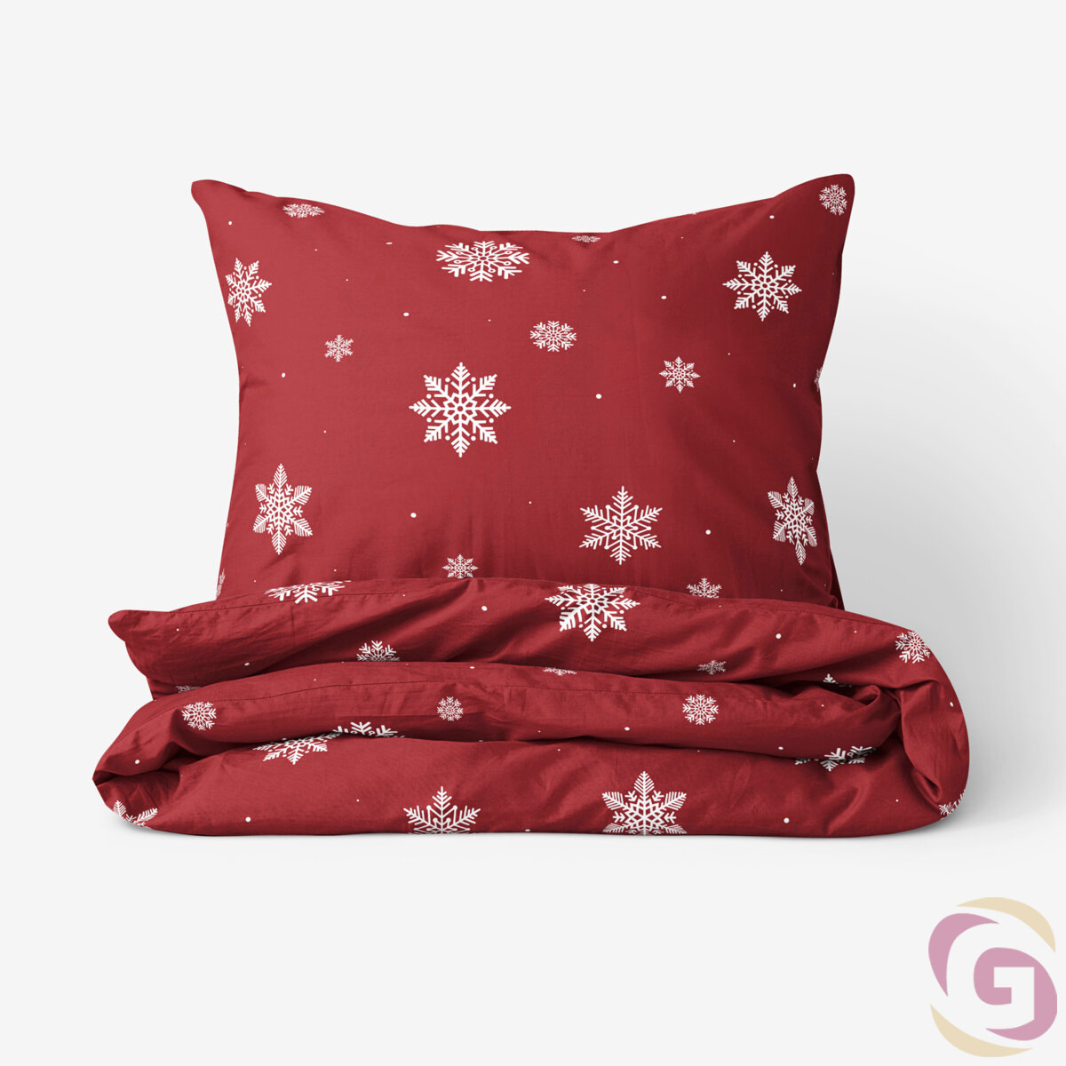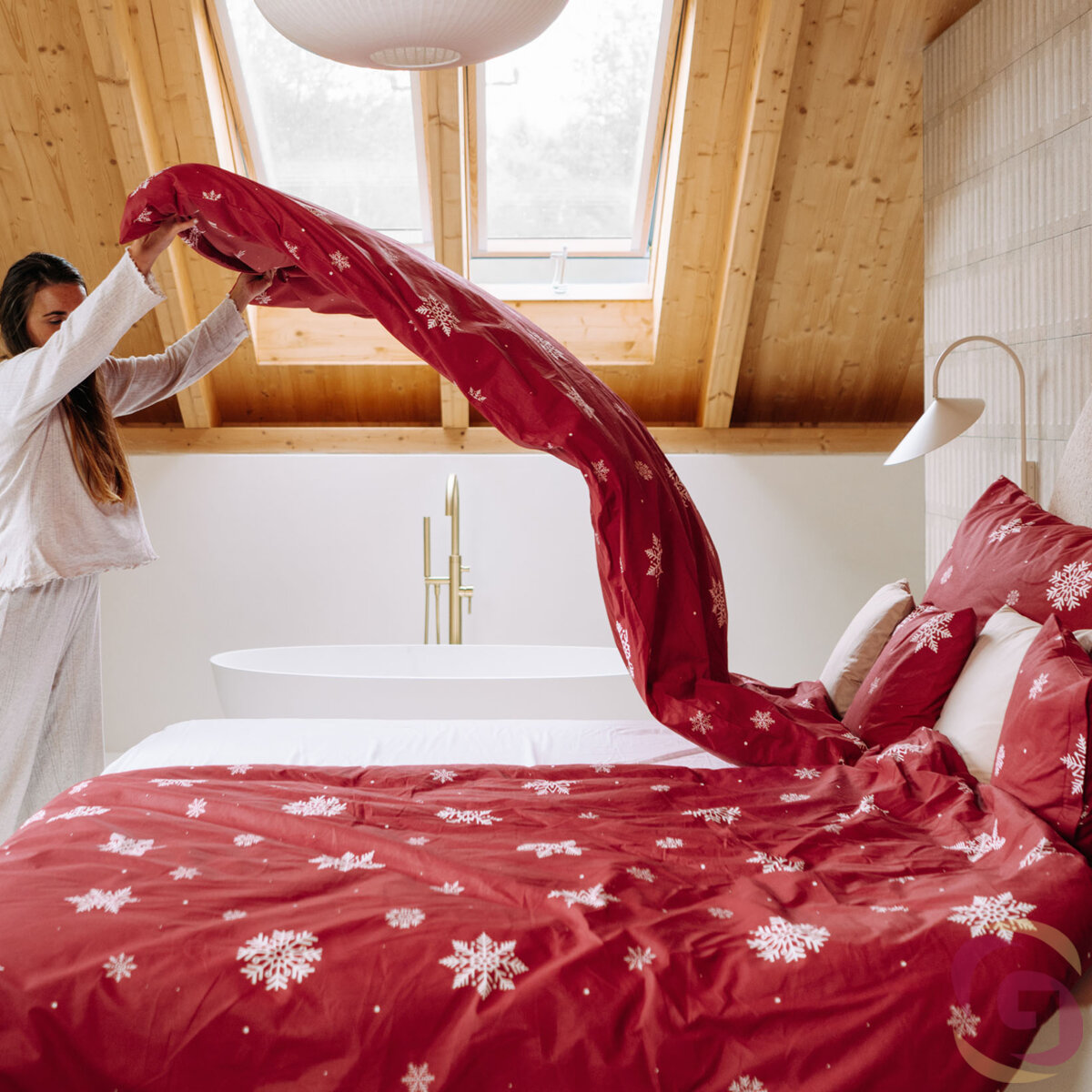 Eleganter roter Weihnachtsbettwäsche mit Schneeflockenmotiv, der Ihrem Schlafzimmer einen Hauch von Luxus und festlicher Atmosphäre verleiht. Mit seinem zeitlosen Design ist er die ideale Wahl für die Weihnachtszeit voller Ruhe, Wärme und Gemütlichkeit.