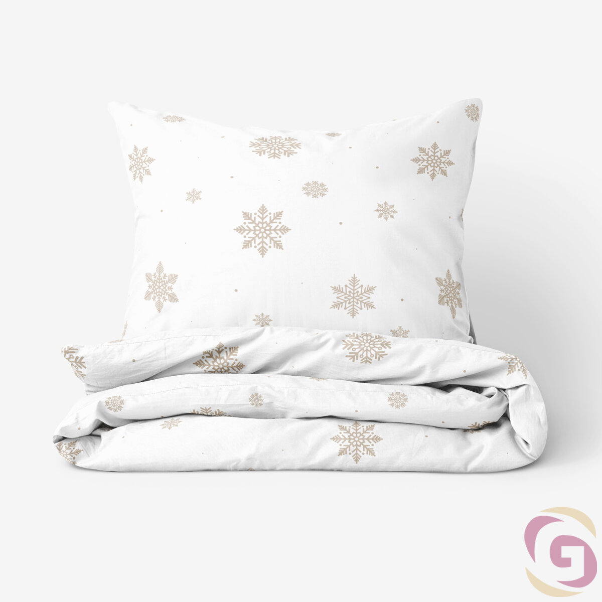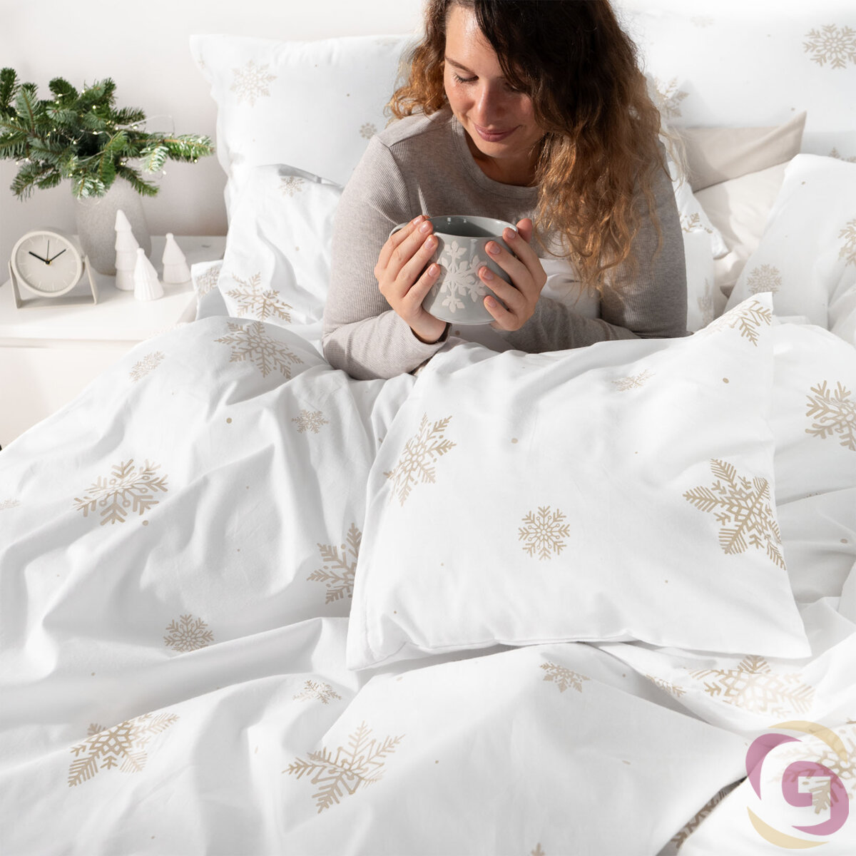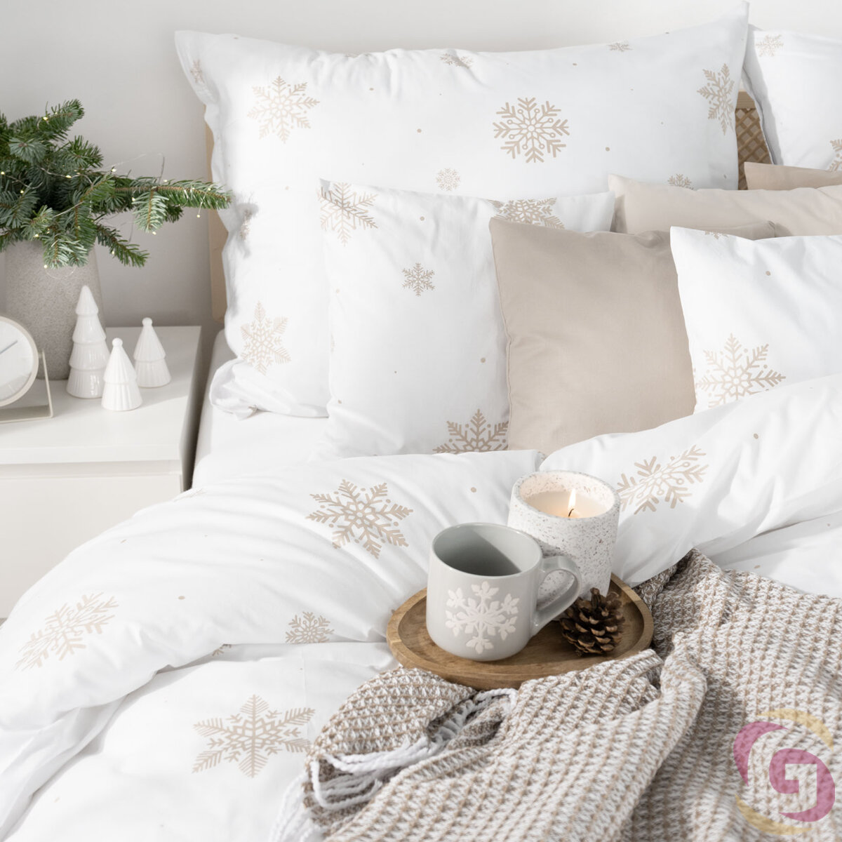 Weihnachtlich Bettwäsche aus Baumwolle Duo - Schneeflocken auf Weiß mit Latte