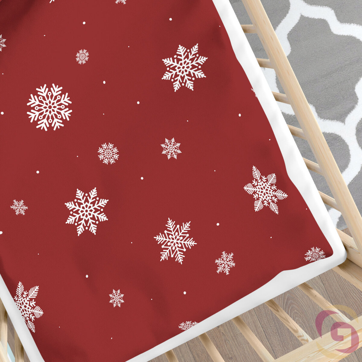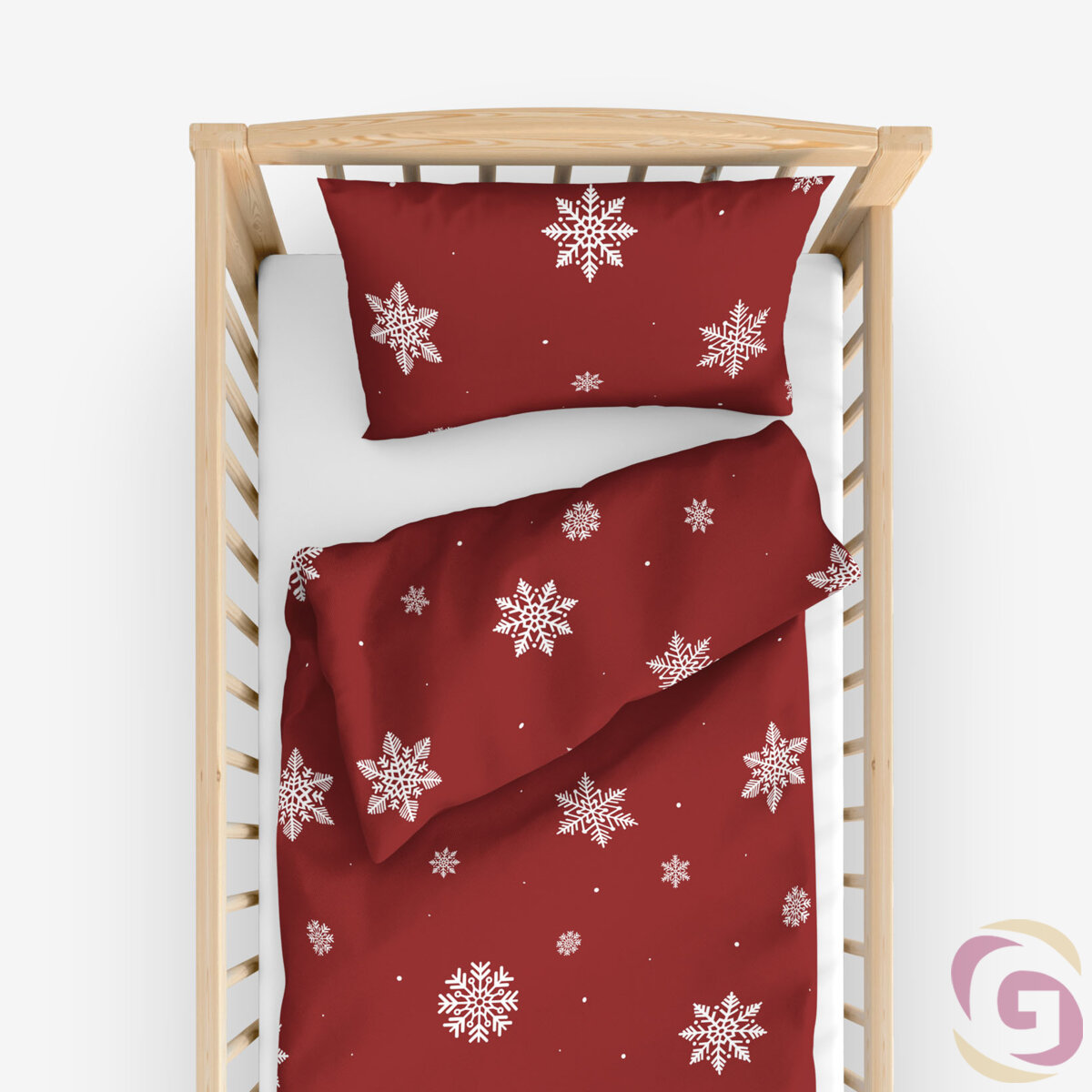 Weihnachtliche Bettwäsche für Babybetten aus Baumwolle - Schneeflocken auf Rot