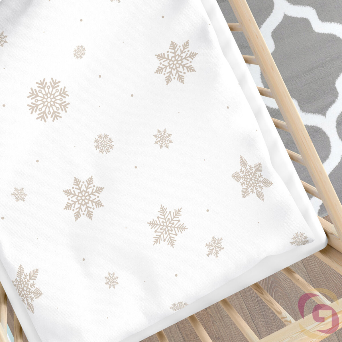 Weihnachtliches Spannbetttuch aus Baumwolle für Babybetten - Schneeflocken auf Weiß