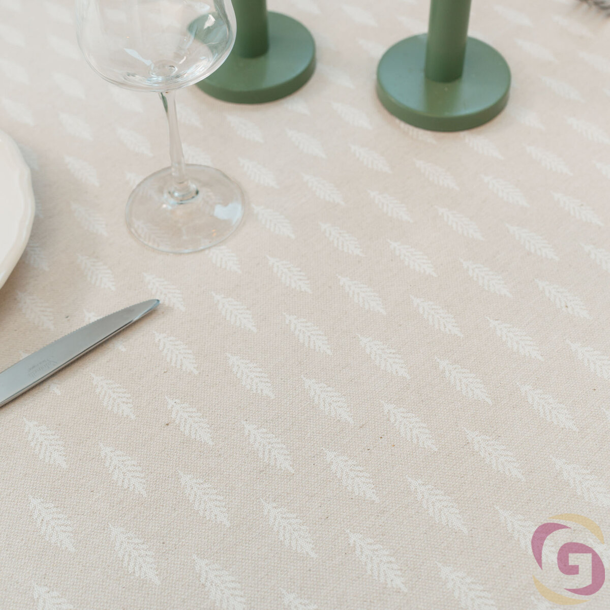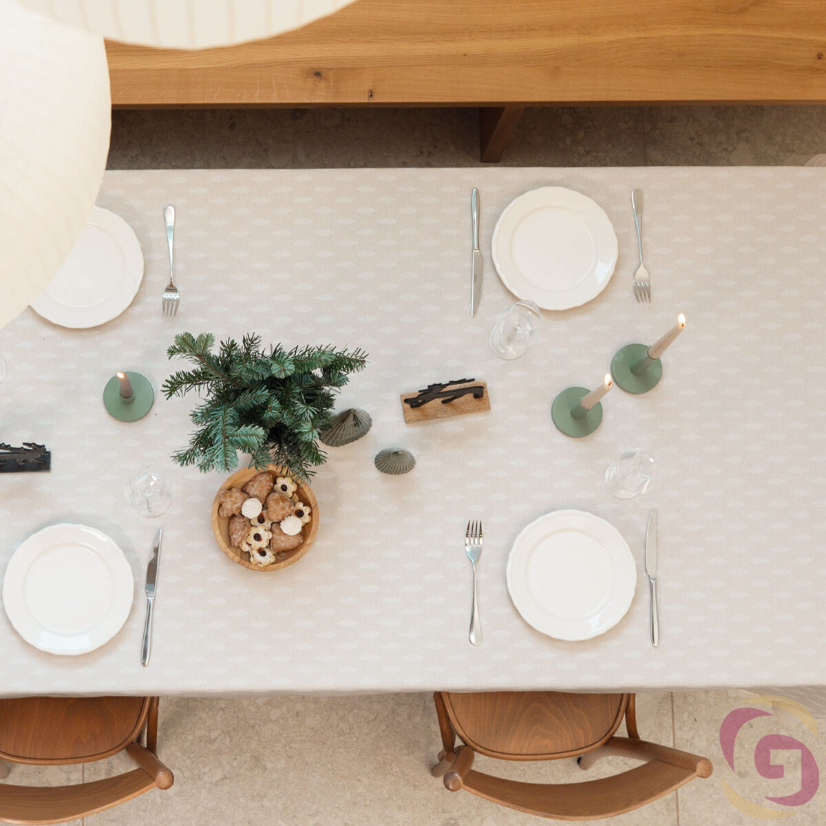 Der Stoff besteht aus einer Mischung aus 80% Baumwolle und 20% Leinen mit einem Gewicht von 220 g/m2. Er ist sehr formstabil und passt perfekt auf jeden Tisch. Das Material ist angenehm anzufassen und strapazierfähig.