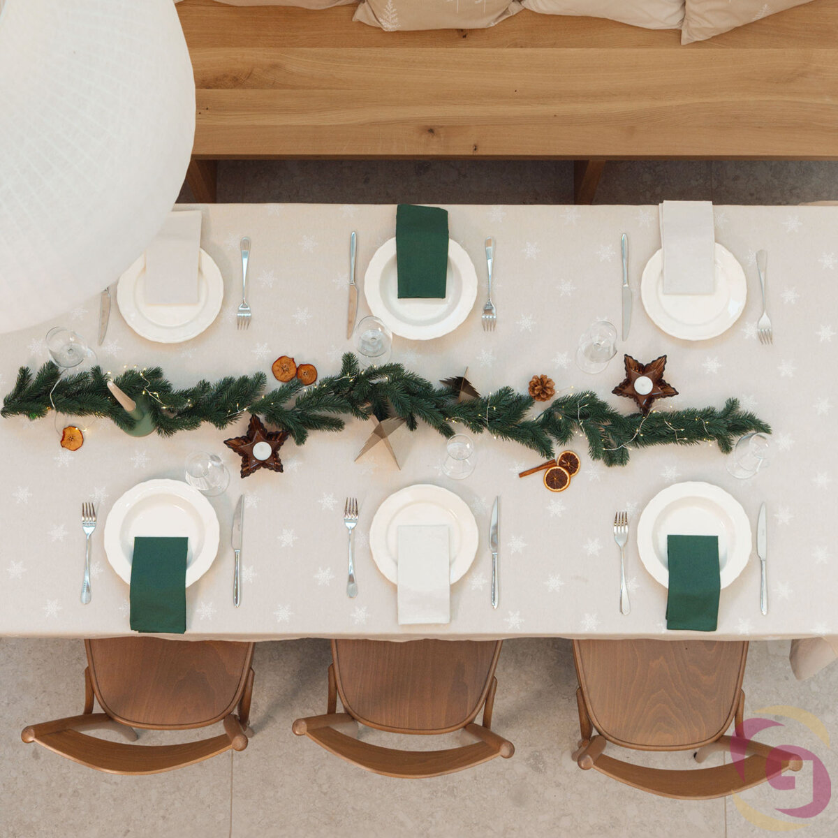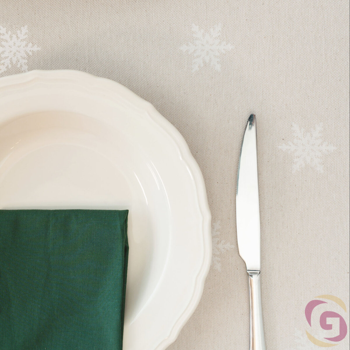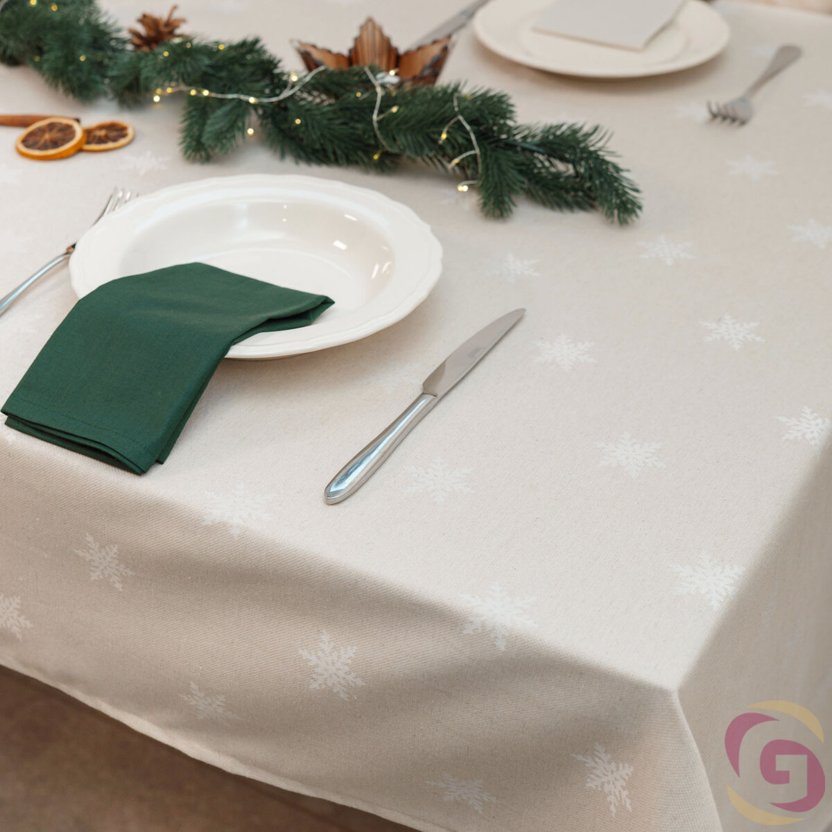 Dekorativer Tischdecke mit Schneeflocken auf natürlichem Untergrund bringt festliche Stimmung und den Zauber der Winterfeiertage in Ihr Zuhause. Das Schneeflockenmuster ergänzt sowohl rustikale als auch moderne Einrichtungen perfekt. Gönnen Sie sich außergewöhnliche Qualität, die nicht nur großartig aussieht, sondern auch jahrelang hält. Verleihen Sie Ihrem Zuhause den letzten Schliff.