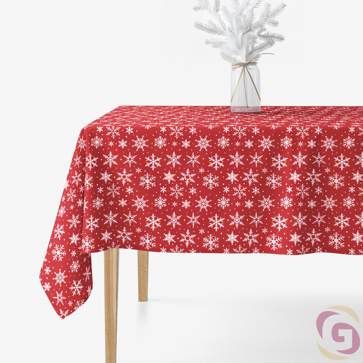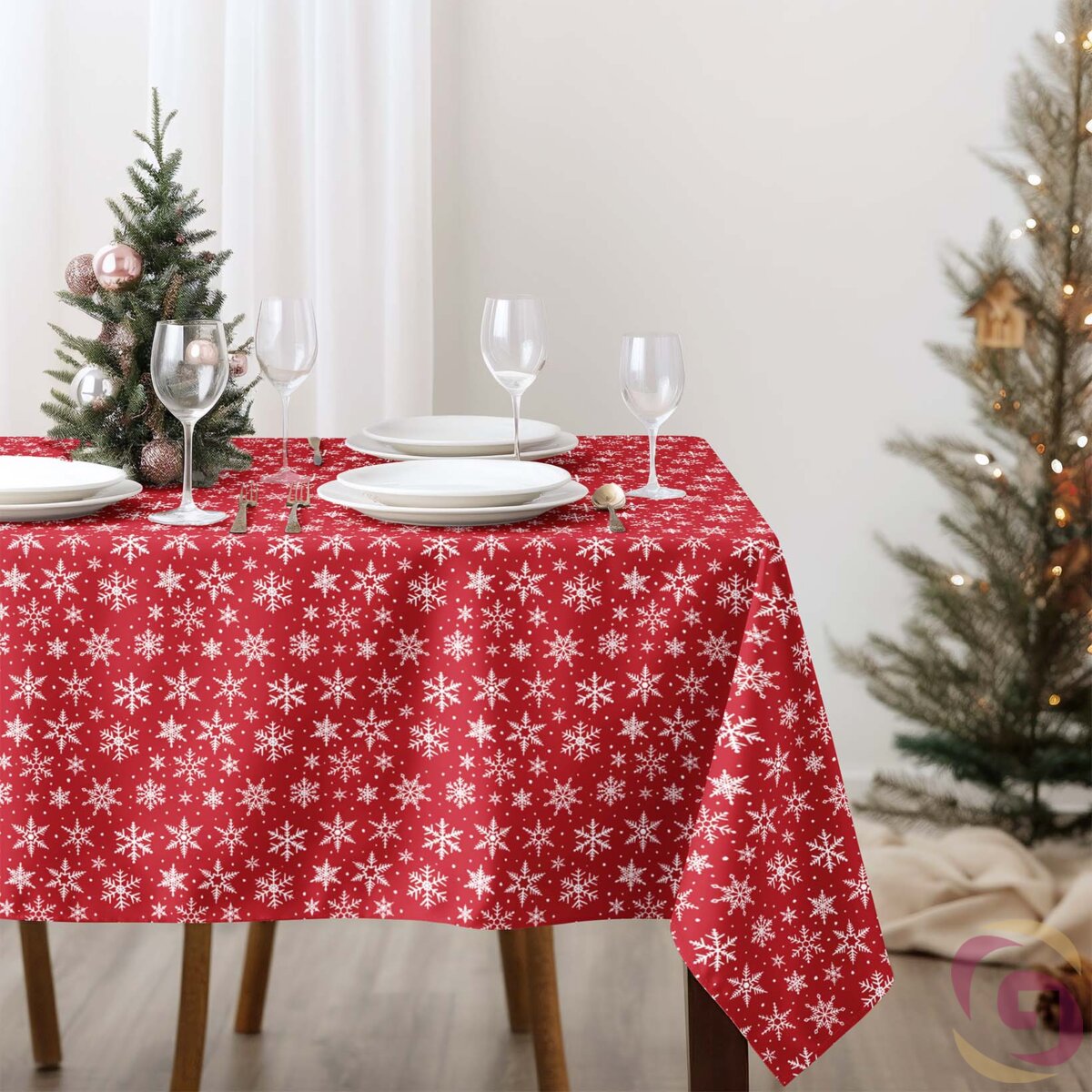 Weihnachtliche eckige Tischdecke Valencia - Weiße Flocken auf Rot