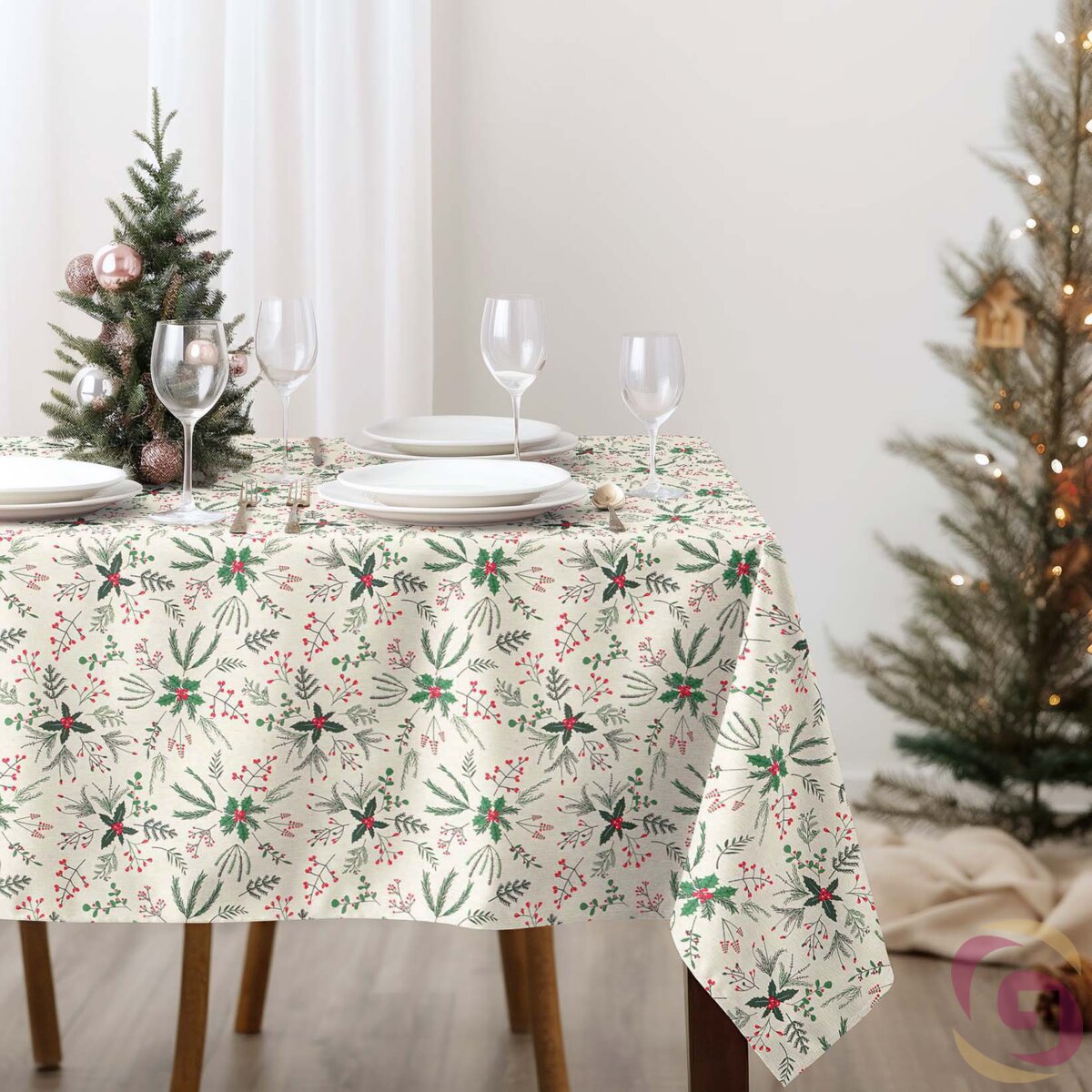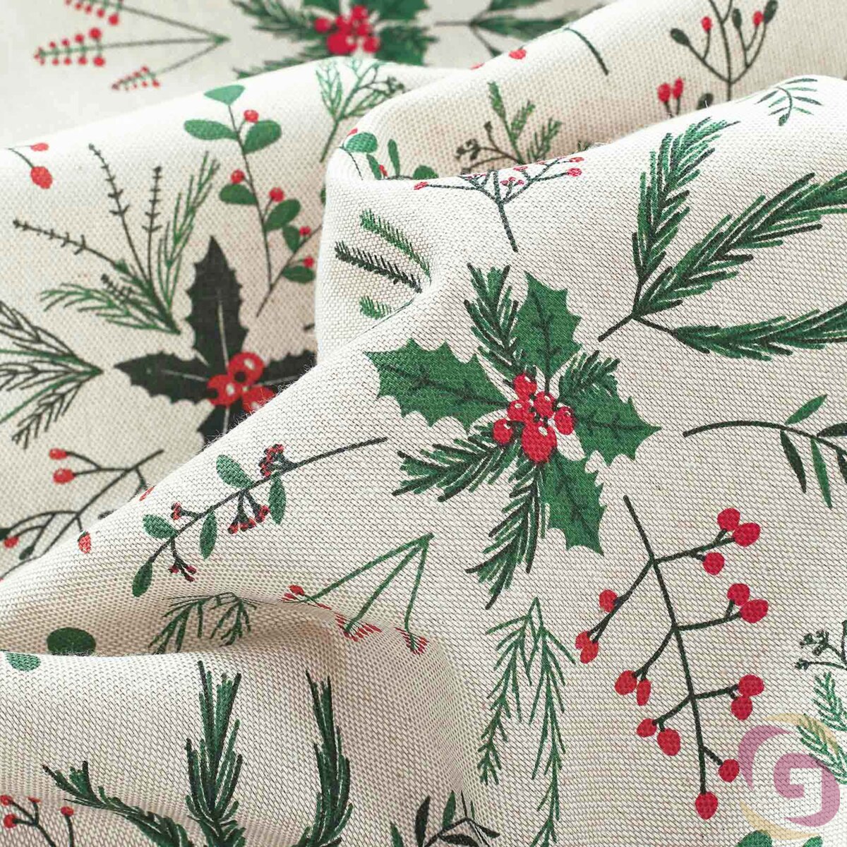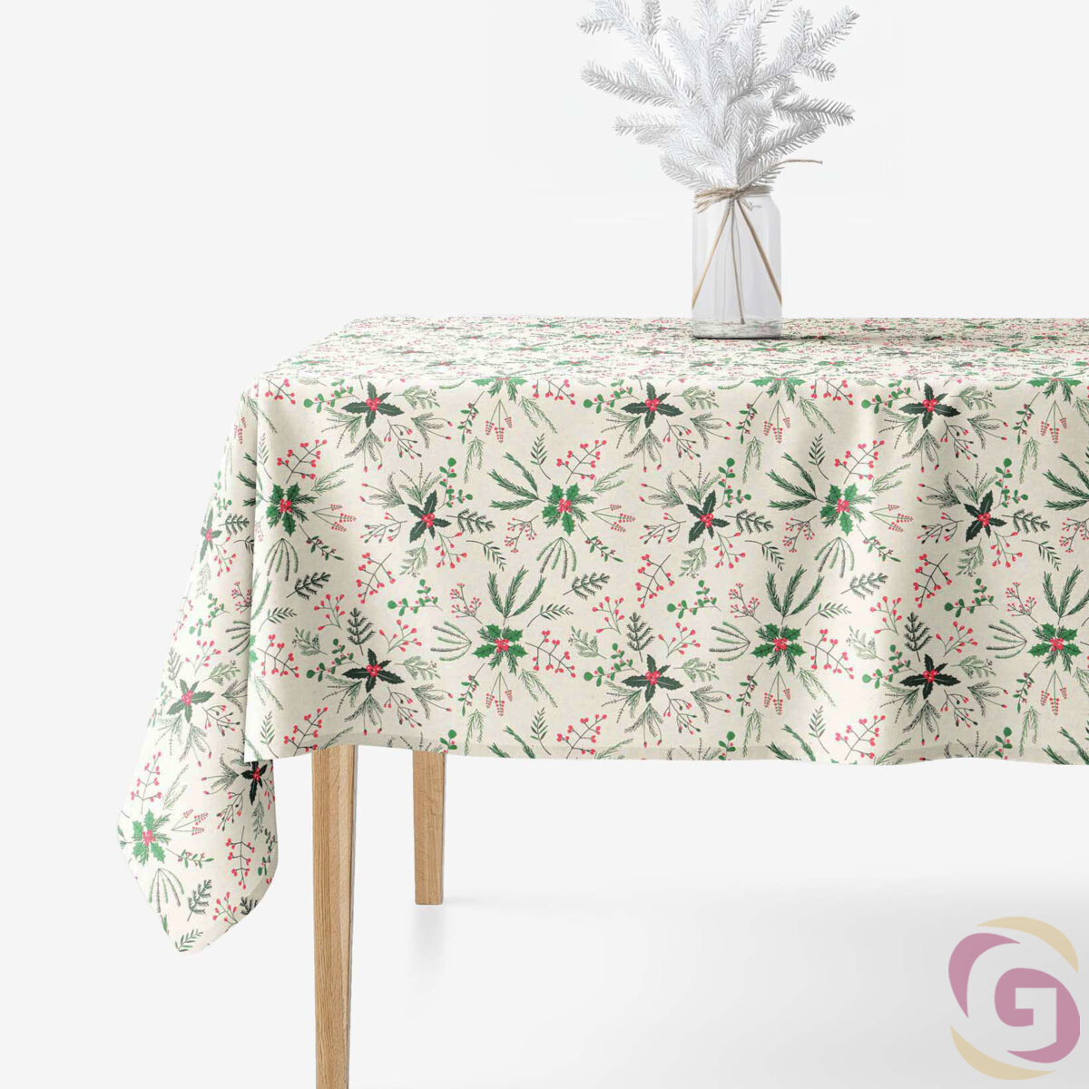 Dekorativer Tischdecke mit Weihnachtszweigen auf naturfarbenem Untergrund bringt festliche Stimmung und den Zauber der Winterfeiertage in Ihr Zuhause. Das zarte Motiv der grünen Zweige ergänzt sowohl rustikale als auch moderne Einrichtungen perfekt. Gönnen Sie sich außergewöhnliche Qualität, die großartig aussieht, jahrelang hält und jedes Essen zu einem besonderen Moment macht. Vervollkommnen Sie Ihr Zuhause.