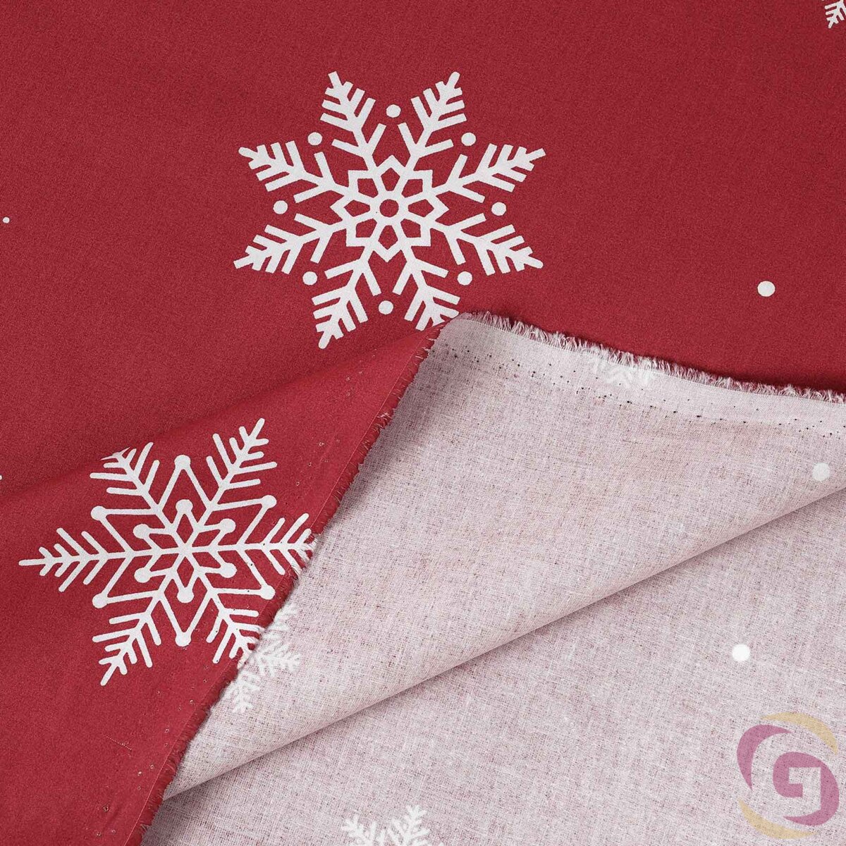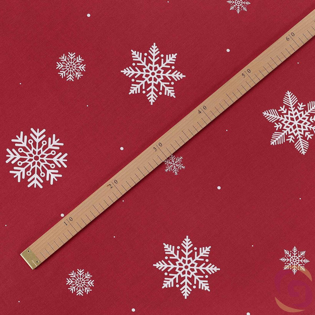 Baumwollstoff mit einem Motiv von Schneeflocken auf rotem Hintergrund. Die Breite des Stoffes beträgt 160 cm. Der Stoff besteht aus hochwertiger, glatter 100 % Baumwolle mit einem Gewicht von 145 g/m2 . Der Baumwollstoff wird als Meterware angeboten, die Mindestabnahmemenge beträgt 0,5 m. Wir bieten auch genähte Produkte aus Baumwollstoff mit einem Motiv von Schneeflocken auf rotem Hintergrund an.