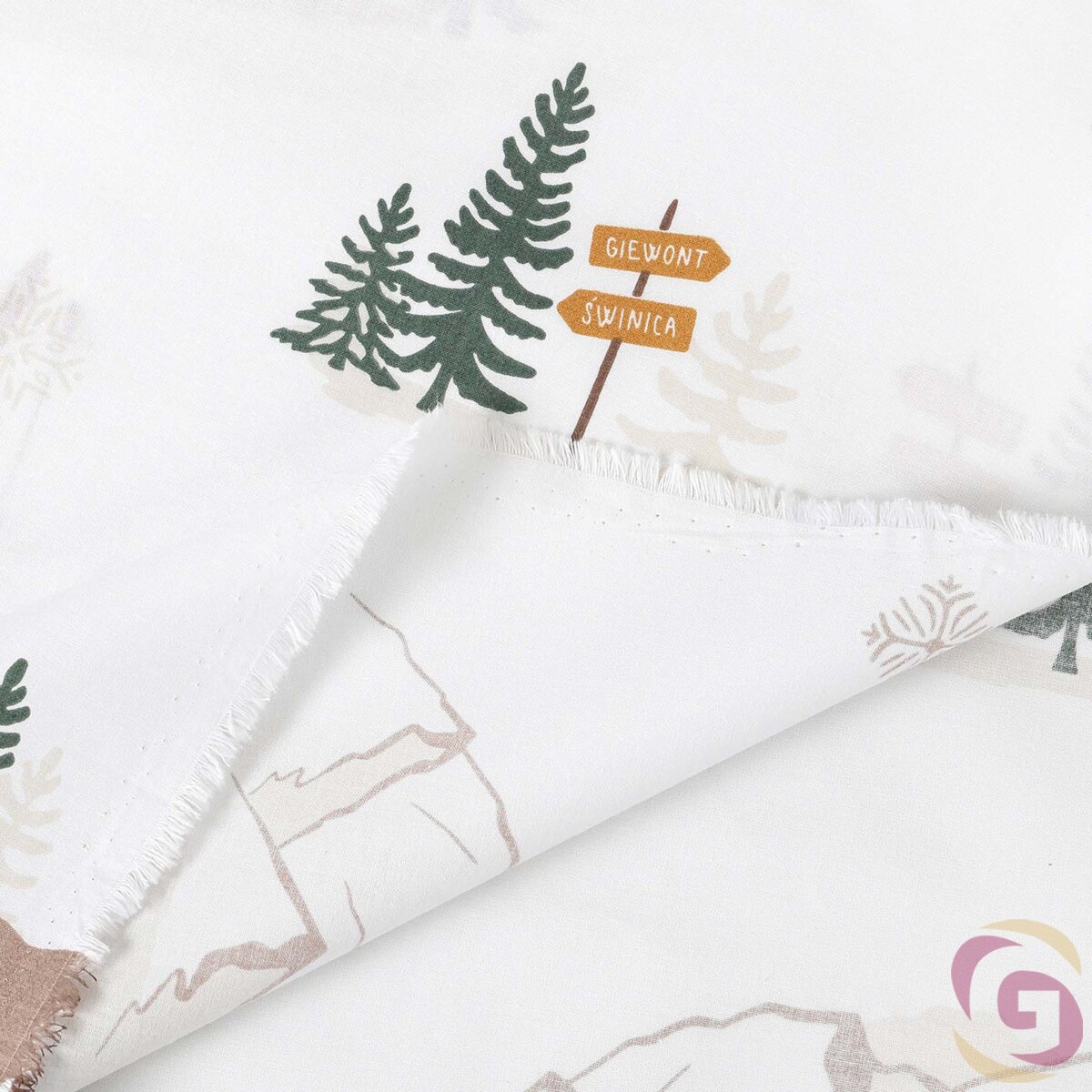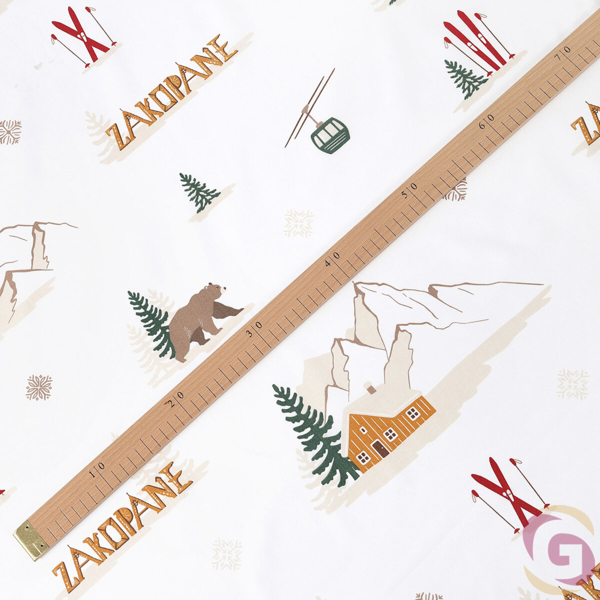 Baumwollstoff mit Motiven von verschneiten Bergen, Holzhäusern und Winterlandschaft auf weißem Hintergrund. Die Breite des Stoffes beträgt 160 cm. Der Stoff besteht aus hochwertiger, glatter 100 % Baumwolle mit einem Gewicht von 145 g/m2 . Der Baumwollstoff wird als Meterware angeboten, die Mindestabnahmemenge beträgt 0,5 m. Wir bieten auch genähte Produkte aus Baumwollstoff mit Motiven von verschneiten Bergen, Holzhäusern und Winterlandschaft auf weißem Hintergrund an.
