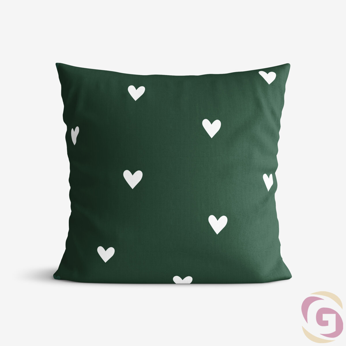 Kissenbezug aus Baumwolle mit Motiv weiße Herzchen auf dunkelgrünem Hintergrund (gleiches Motiv auf beiden Seiten). Der Kissenbezug ist aus hochwertiger und angenehmer 100% Baumwolle gefertigt. Er hat einen praktischen Reißverschluss.