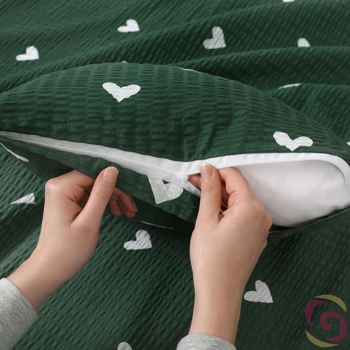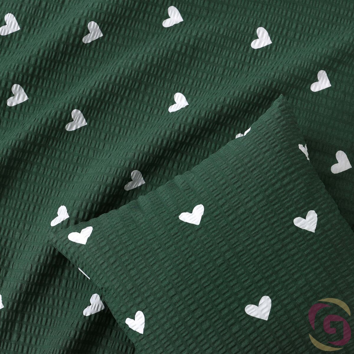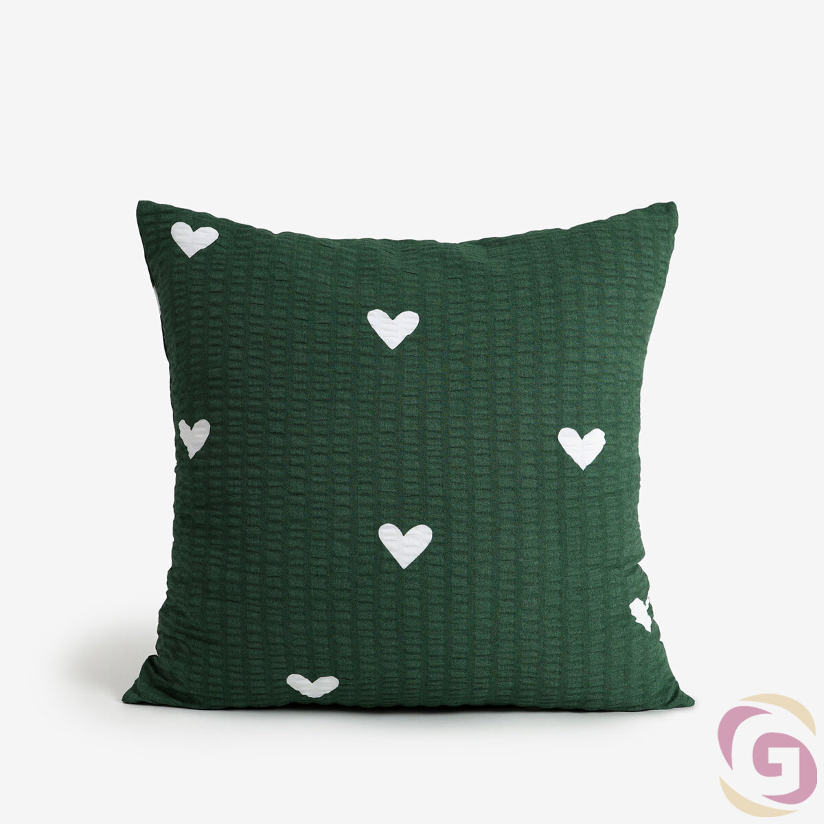 Weihnachtlicher Seersucker-Kissenbezug - Herzchen auf dunkelgrün