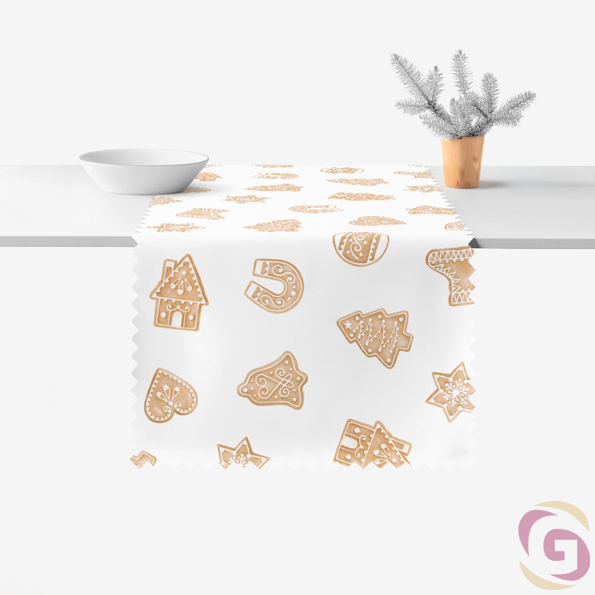 Tischläufer aus der Kollektion mit Lebkuchenmuster auf weißem Untergrund. Das verspielte Lebkuchenmotiv bringt eine gemütliche Weihnachtsstimmung in Ihr Zuhause und ergänzt festliche Dekorationen perfekt.