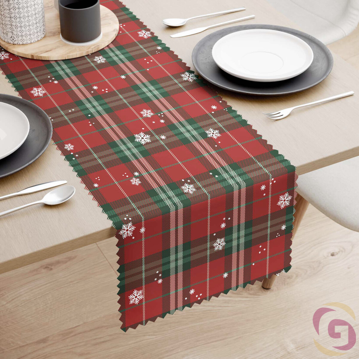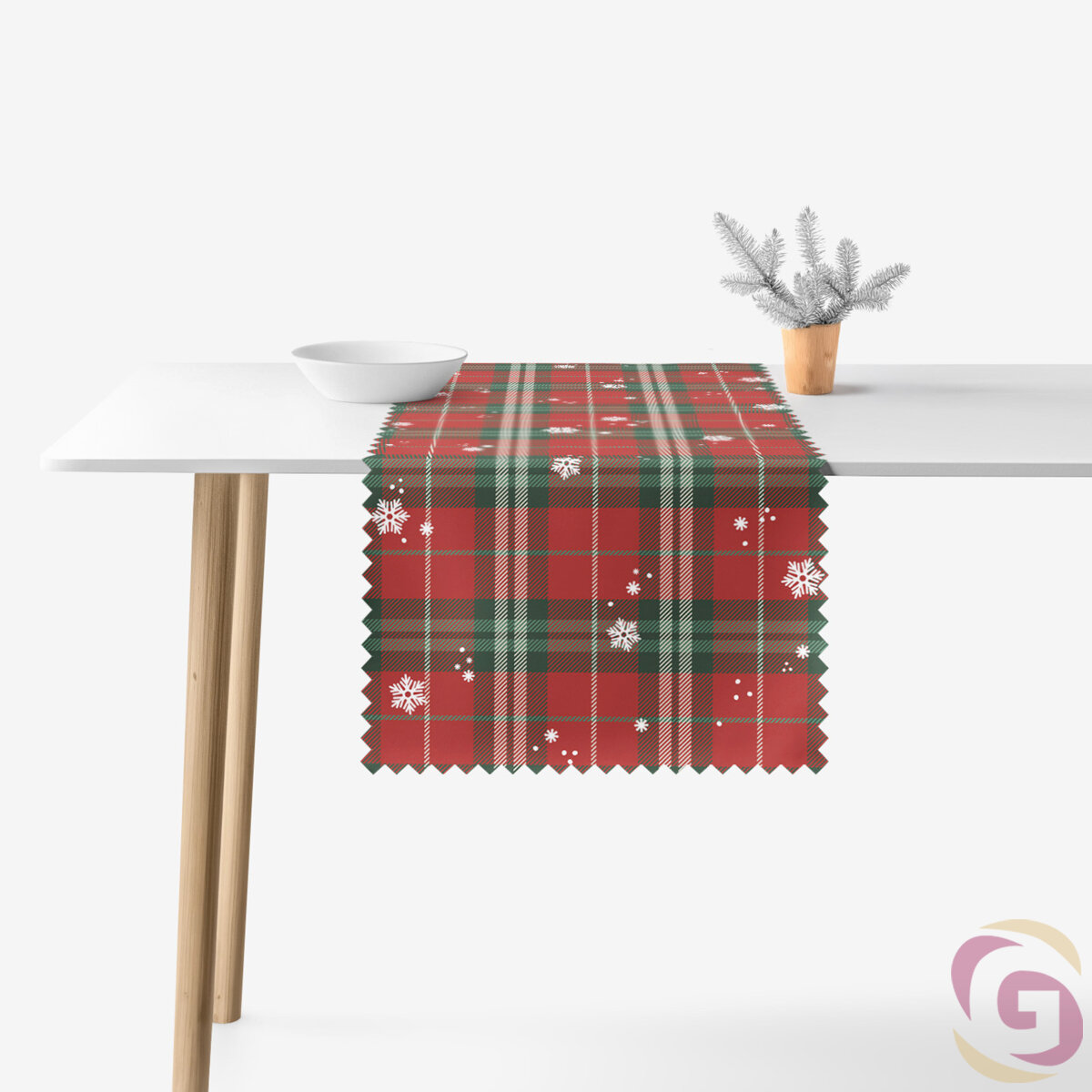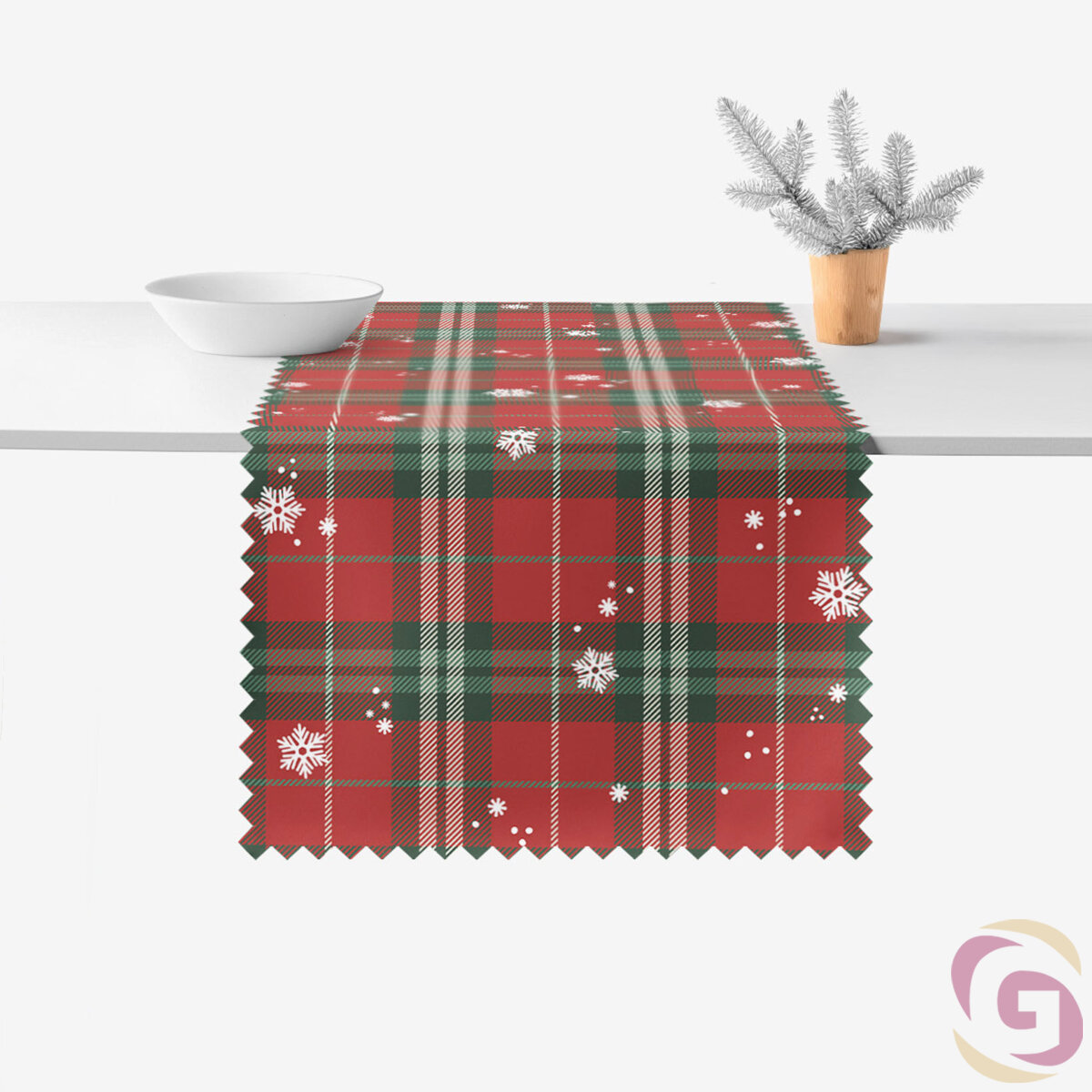 Das Tischläufer ist mit einem klassischen Karomuster in Rot, Grün und Weiß verziert, mit fein verteilten weißen Schneeflocken, die einen dezenten winterlichen Akzent setzen. Die Kombination aus traditionellem Karomotiv und kleinen Flocken schafft eine festliche und gemütliche Atmosphäre, ideal für weihnachtliche Dekorationen.