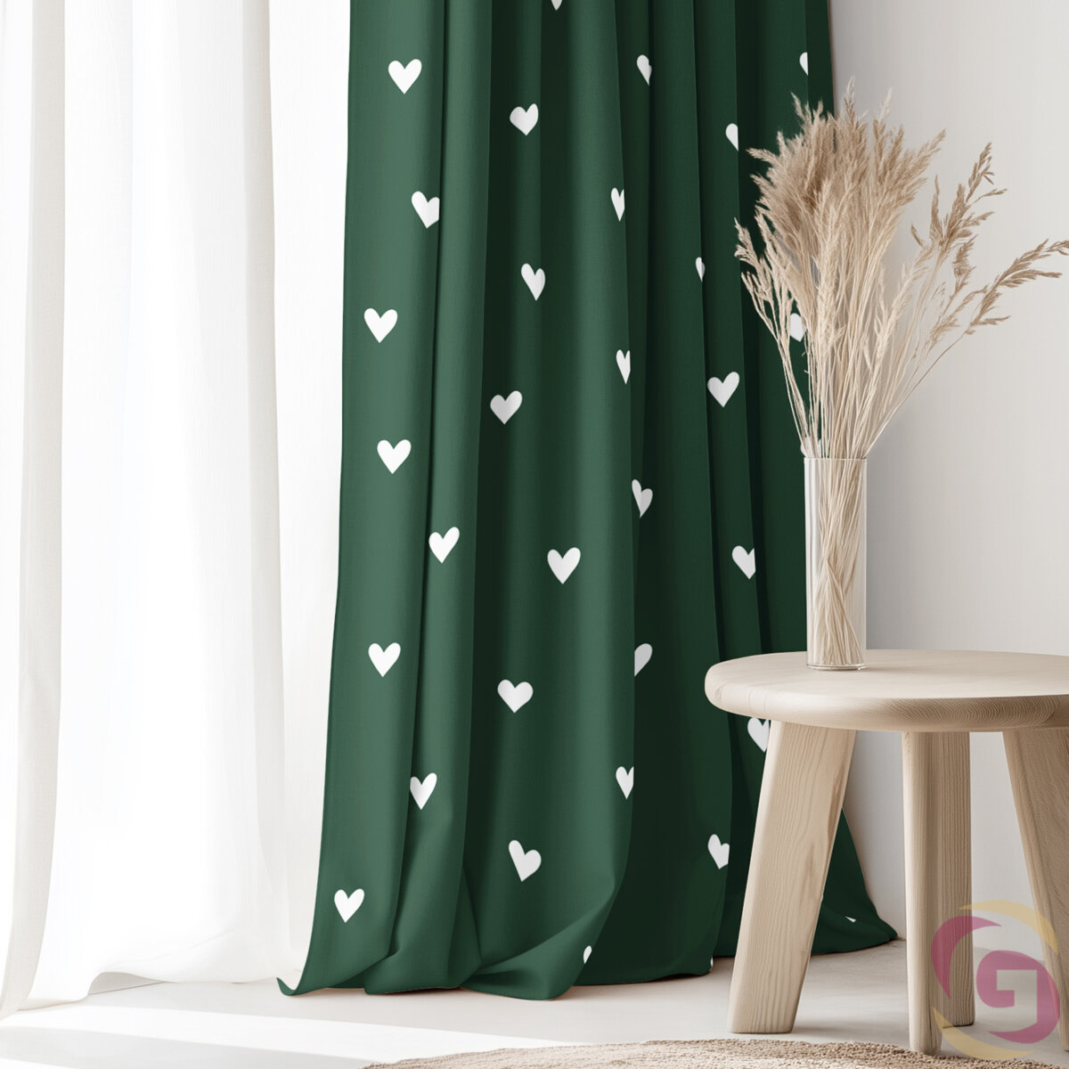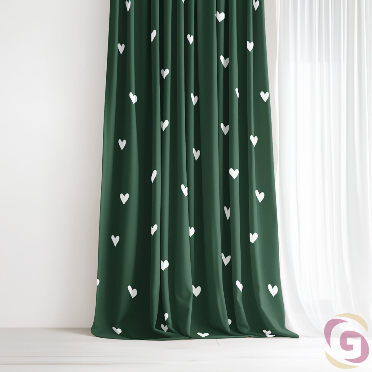 Der Baumwollvorhang mit einem Motiv weiße Herzchen auf dunkelgrünem Hintergrund. Wir nähen diesen Vorhang aus Baumwollstoff - Herzchen auf dunkelgrün mit einem Gewicht von 145 g/m2. Es handelt sich um einen dicht gewebten Stoff aus 100 % Baumwolle. Der Vorhang hat einen hochwertigen einseitigen Druck und ist ausschließlich für dekorative Zwecke bestimmt (er verdunkelt den Raum nicht, sondern beschattet ihn).