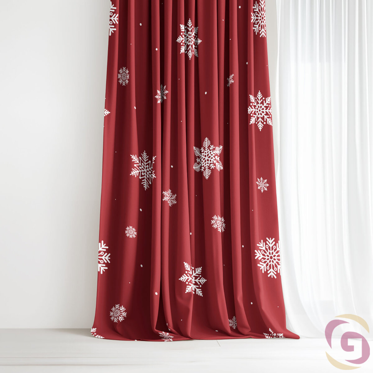 Der Baumwollvorhang mit einem Motiv von Schneeflocken auf rotem Hintergrund. Wir nähen diesen Vorhang aus Baumwollstoff - Schneeflocken auf Rot mit einem Gewicht von 145 g/m2. Es handelt sich um einen dicht gewebten Stoff aus 100 % Baumwolle. Der Vorhang hat einen hochwertigen einseitigen Druck und ist ausschließlich für dekorative Zwecke bestimmt (er verdunkelt den Raum nicht, sondern beschattet ihn).