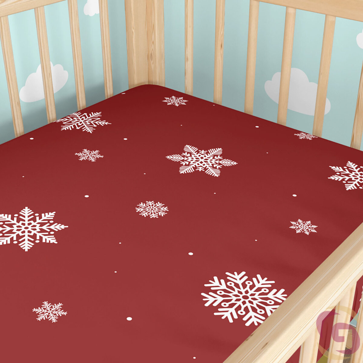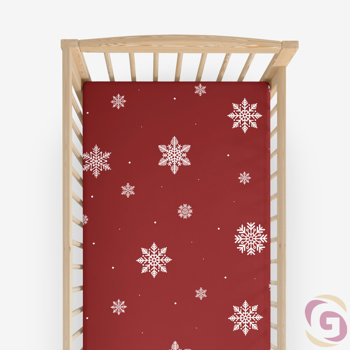 Elegantes rotes Weihnachtsbettlaken für das Kinderbett mit Schneeflocken-Motiv, das dem Kinderzimmer einen Hauch von Luxus und festlicher Atmosphäre verleiht. Durch sein zeitloses Design ist es die ideale Wahl für die Weihnachtszeit voller Ruhe, Wärme und Gemütlichkeit.