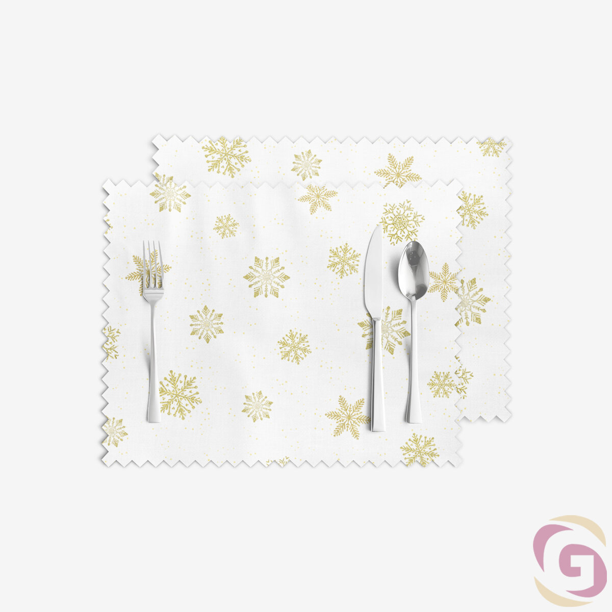 Das Tischset ist mit einem Motiv goldener Schneeflocken auf weißem Hintergrund verziert, was elegant und frisch wirkt. Die glänzenden goldenen Details der Schneeflocken verleihen einen feinen Schimmer und ein luxuriöses Aussehen. Dieses Muster ist ideal für die Weihnachtsdekoration, da es eine festliche Atmosphäre voller winterlicher Gemütlichkeit und festlichem Zauber in Ihr Zuhause bringt.