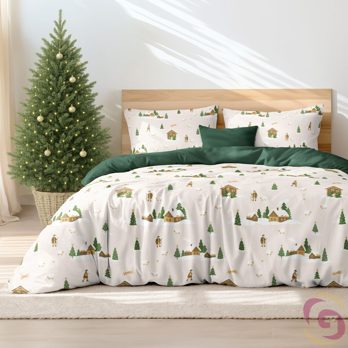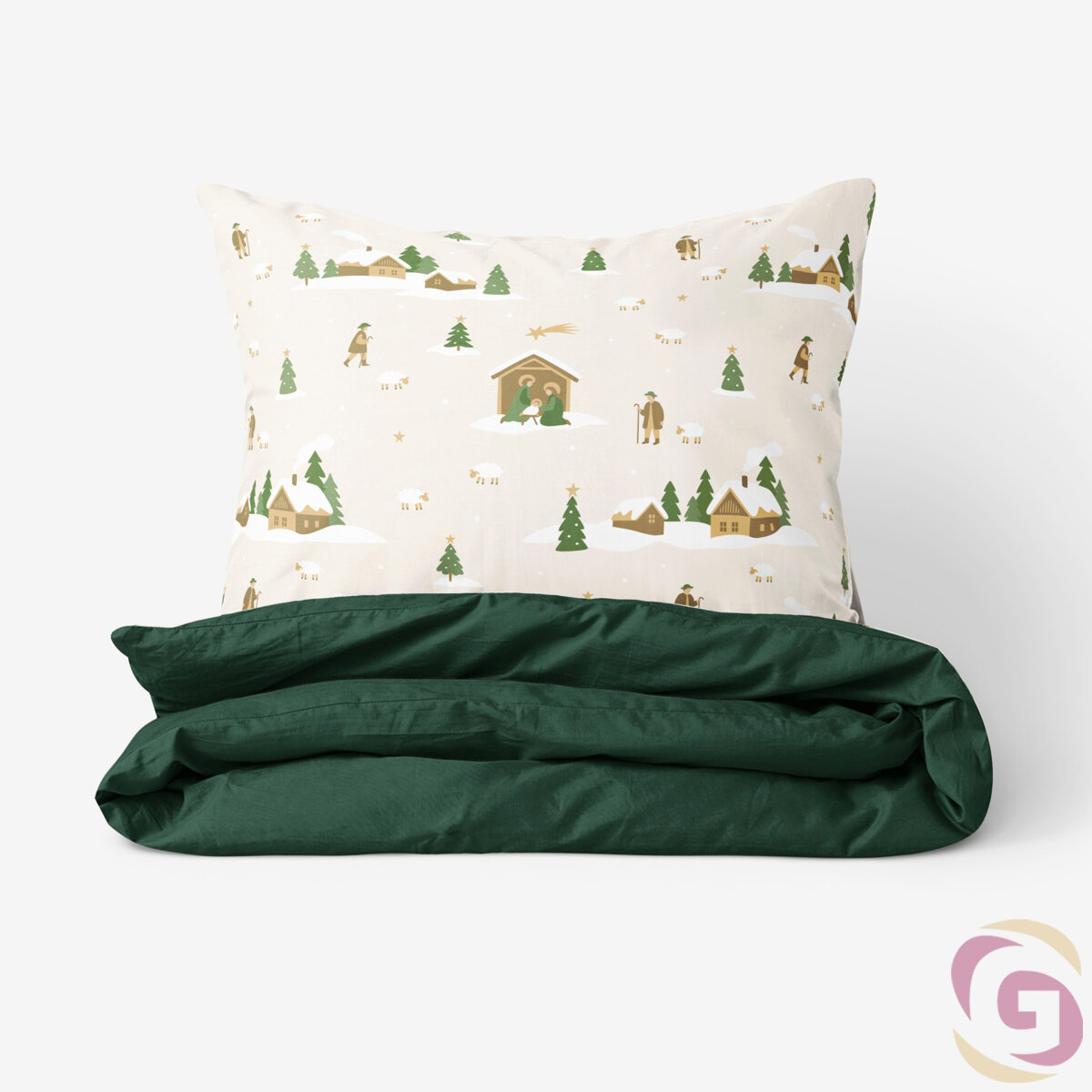 Weihnachtsbettwäsche Duo – auf der einen Seite mit einem traditionellen Motiv einer Winterlandschaft und einer Krippenszene, auf der anderen Seite in einfarbigem Dunkelgrün. Die hochwertige Baumwollbettwäsche schafft eine warme und gemütliche Atmosphäre, in der Sie die festliche Zeit in vollen Zügen genießen können.