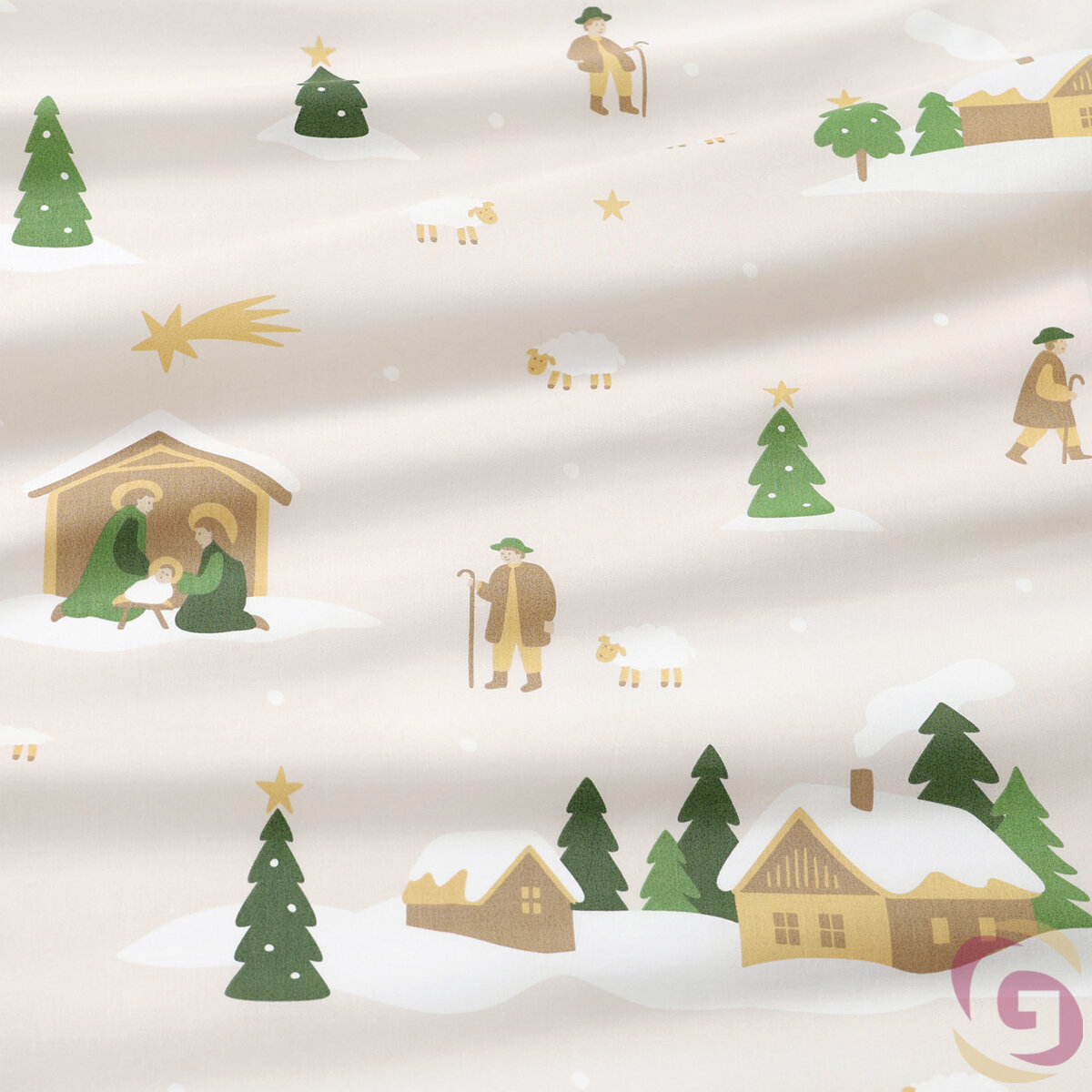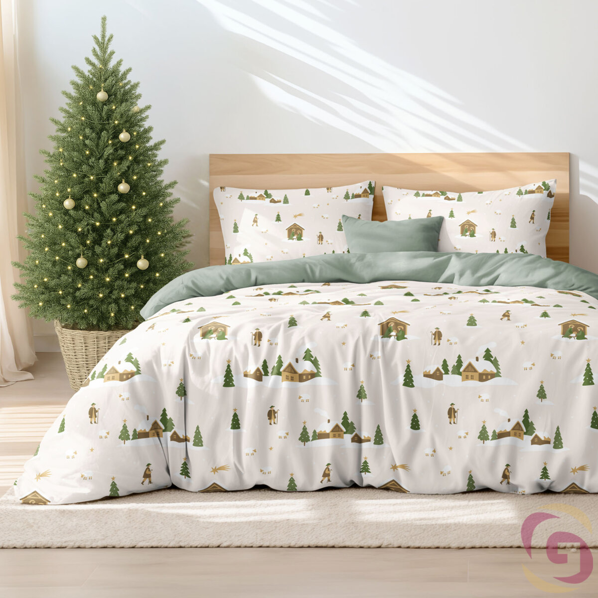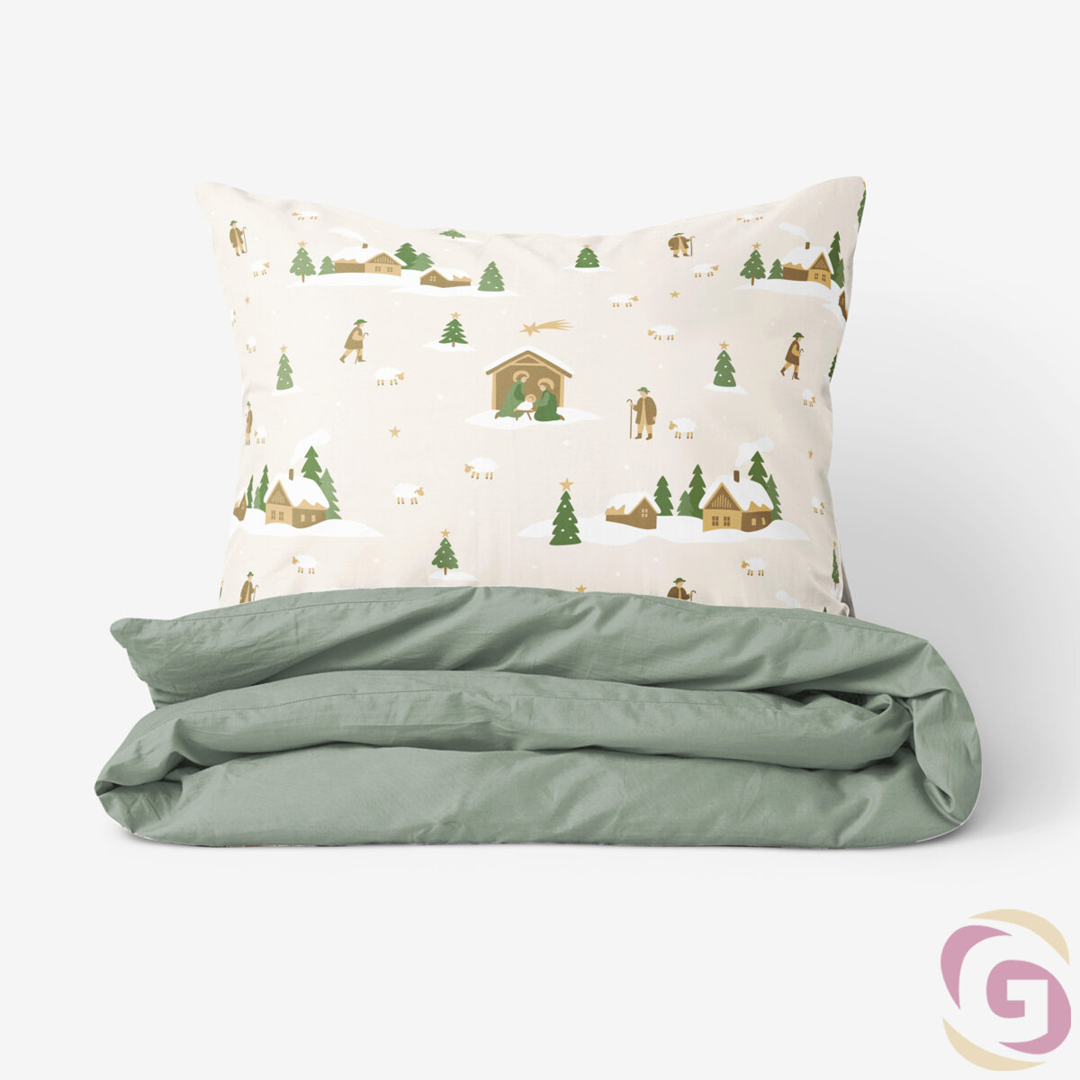 Weihnachtsbettwäsche Duo – auf der einen Seite mit einem traditionellen Motiv einer Winterlandschaft und einer Krippenszene, auf der anderen Seite in einfarbigem Salbeigrün. Die hochwertige Baumwollbettwäsche schafft eine warme und gemütliche Atmosphäre, in der Sie die festliche Zeit in vollen Zügen genießen können.
