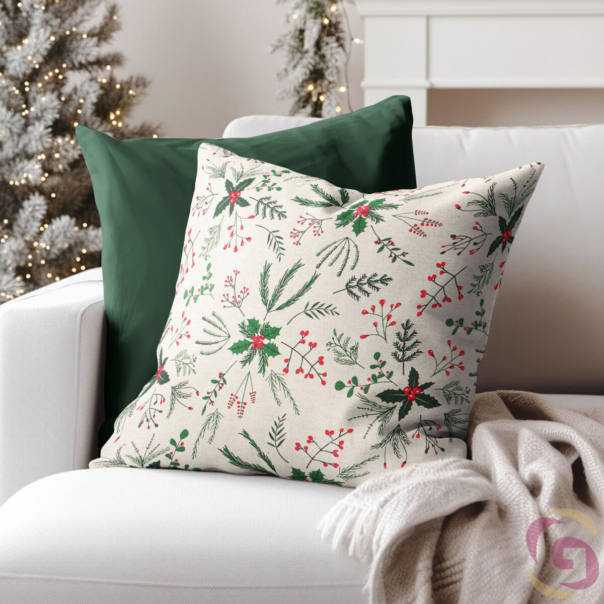 Dekoratives Kissen mit Weihnachtszweigen auf naturfarbenem Stoff bringt festliche Stimmung und den Zauber der Winterfeiertage in Ihr Zuhause. Das feine Motiv grüner Zweige ergänzt sowohl rustikale als auch moderne Einrichtungen perfekt. Gönnen Sie sich außergewöhnliche Qualität, die großartig aussieht und über Jahre hinweg hält. Verleihen Sie Ihrem Zuhause den letzten Schliff.